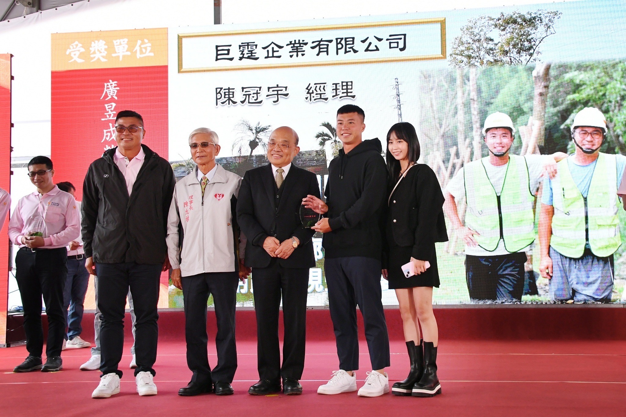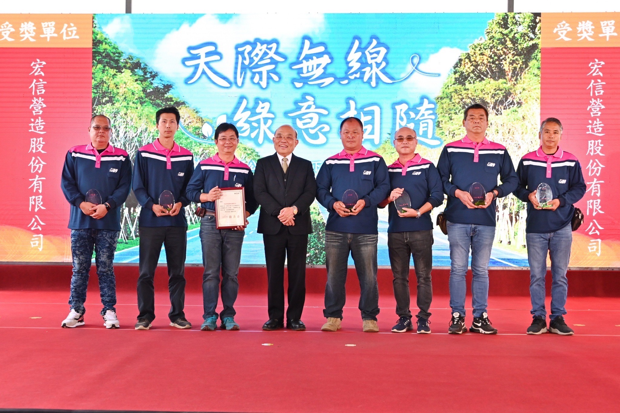 蘇院長抵達會場後,與現場貴賓共同站在紅地毯前端,以熱烈掌聲歡迎參與此次計畫的工程英雄進場,並與全場貴賓及工程英雄於座位上一同比讚合影。隨後,蘇院長觀賞工程全紀錄影片,並聽取吳昭煌處長簡報計畫執行經過。而此次活動特別邀請各工程單位、協力單位及施工廠商代表上臺,分享施工期間的甘苦談,期間蘇院長也親切與工程英雄們互動致意,現場掌聲及歡呼聲不斷。致詞結束後,蘇院長親自頒發18面感謝獎牌予參與的工程單位、協力單位及施工廠商,並頒發獎座予104位工程英雄,逐一與得獎英雄及其親友合影留念,場面熱絡溫馨。