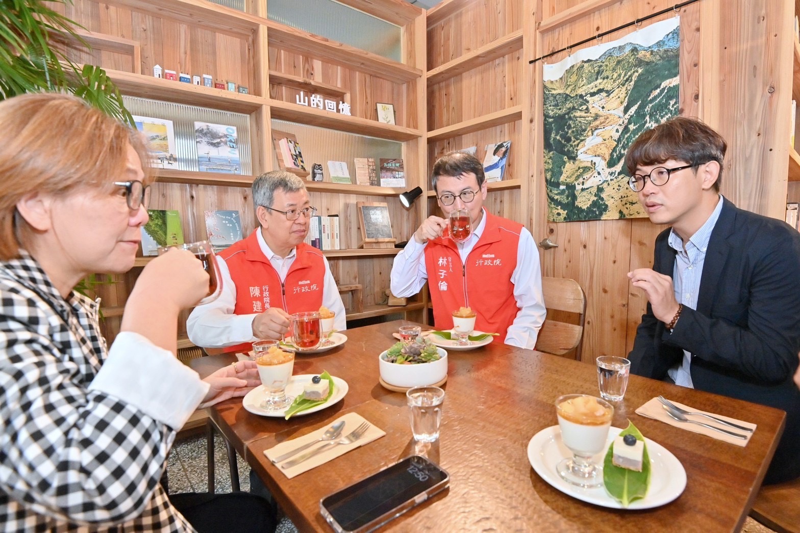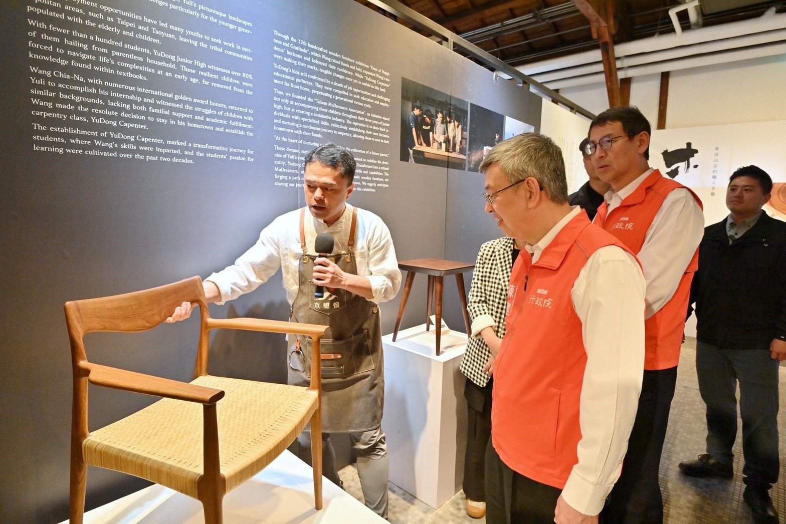 陳院長到場後,首先聽取文化部文創發展司江清松司長說明「花蓮文化創意產業園區業務簡報」,並於致詞結束後,與行政院林子倫發言人、東部聯合服務中心郭應義副執行長、文化部王時思次長、財團法人臺灣生活美學基金會謝翠玉執行長、林淑萍主任等人於花蓮文創園區內參觀「來自山谷的職人手藝-木想傢國產材手作家具特展」,由策展人王嘉納老師說明策展理念,王老師帶領一群縱谷青年使用國產木材打造手工木作家具,使技藝得以傳承,並增加在地就業機會,開拓臺灣木工藝的創新願景;接續,一行人參觀《布農。密碼——與月亮的約定》特展,由策展人陳秀美老師解說,介紹布農族傳統祭事曆、石板屋、宗家屋模型及釀造小米酒的小米植栽原貌,並至青年創業家賴冠羽先生在園區所經營的樂見咖啡館,了解其創業理念及品嚐咖啡館特色美食。