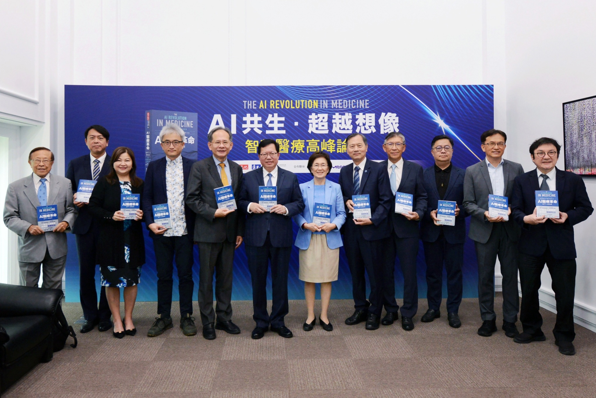 致詞結束後,鄭副院長與主辦單位遠見·天下文化事業群創辦人高希均、社長王力行、臺灣AI Lab創辦人杜奕瑾、廣達副總經理張嘉淵、默克總經理余文慧、華碩總經理吳漢章、成大醫院健康數據資源中心執行長蔣榮先、臺中榮民總醫院院長陳適安、臺北醫學大學董事長陳瑞杰、校長吳麥斯、國家衛生研究院副院長許惠恒等人合影留念。