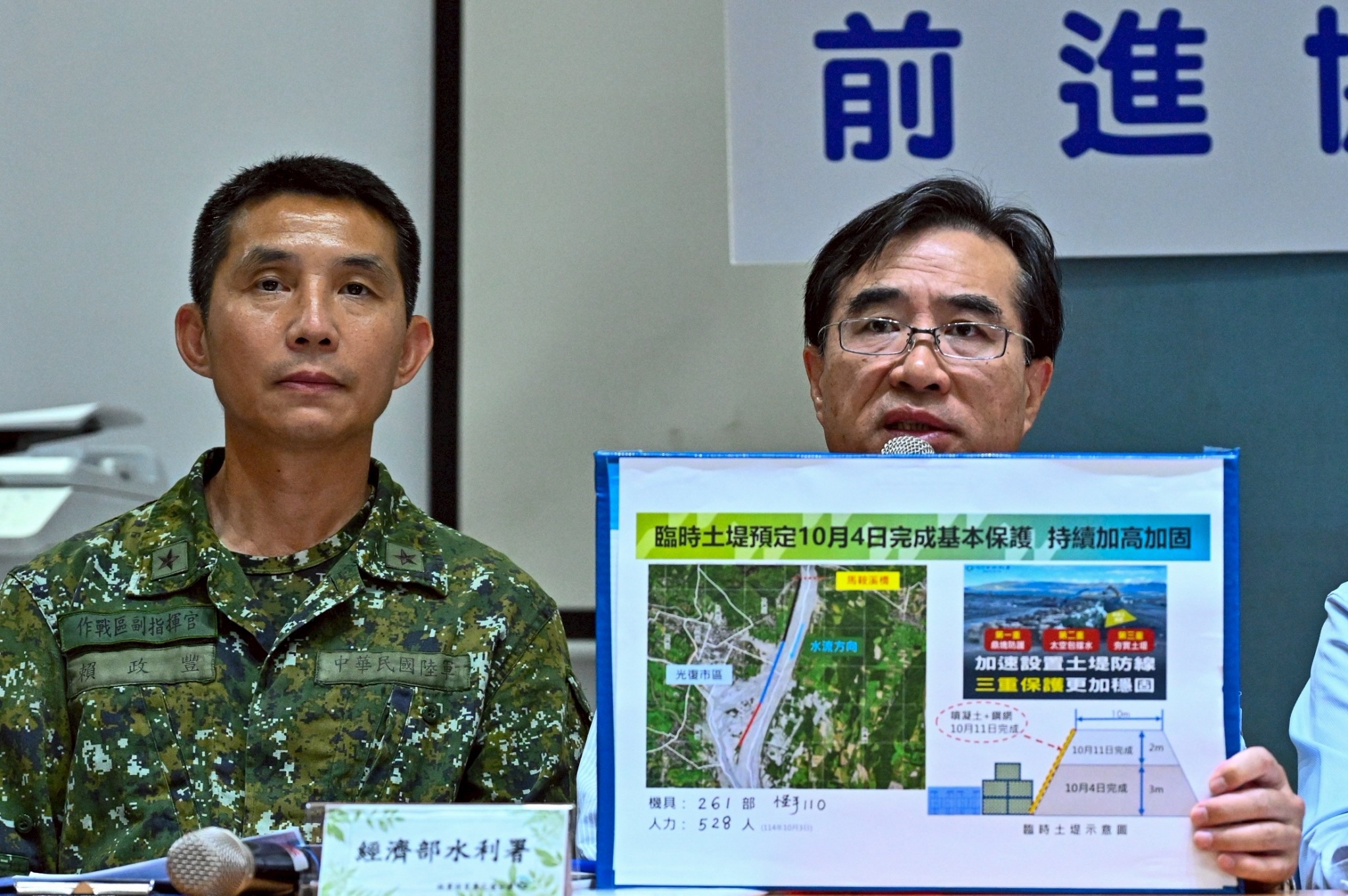此外,經濟部水利署林元鵬署長補充說明,目前水利署救災機具及人力量能充足,復原進度良好,昨日單日即完成逾700公尺的臨時堤防建置,執行進度達8成以上,預估明日將可完成第一階段3公尺高土堤建構,水利署後續也會進行相關修坡及整建工程;此外,經濟部龔明鑫部長昨日前來災區視察時亦指示加強土堤防水性。對此,林署長說明,水利署規劃在土堤表面運用鋼網及噴凝土加強防水效果,預計在下週六(10/11)完成,同時於第二階段再加高土堤2公尺,以達一定保護標準。