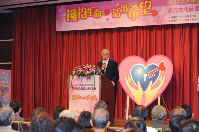 行政院長吳敦義今(7)日出席2011世界自殺防治日記者會時表示,人民的安全是政府無可旁貸的責任,這幾年自殺身亡的人數已陸續下降,他除肯定自殺防治的成果,也強調政府一定會支持自殺防治工作,力求降低自殺死亡人數,一個都不能少,努力保住每一條寶貴的生命與家庭。