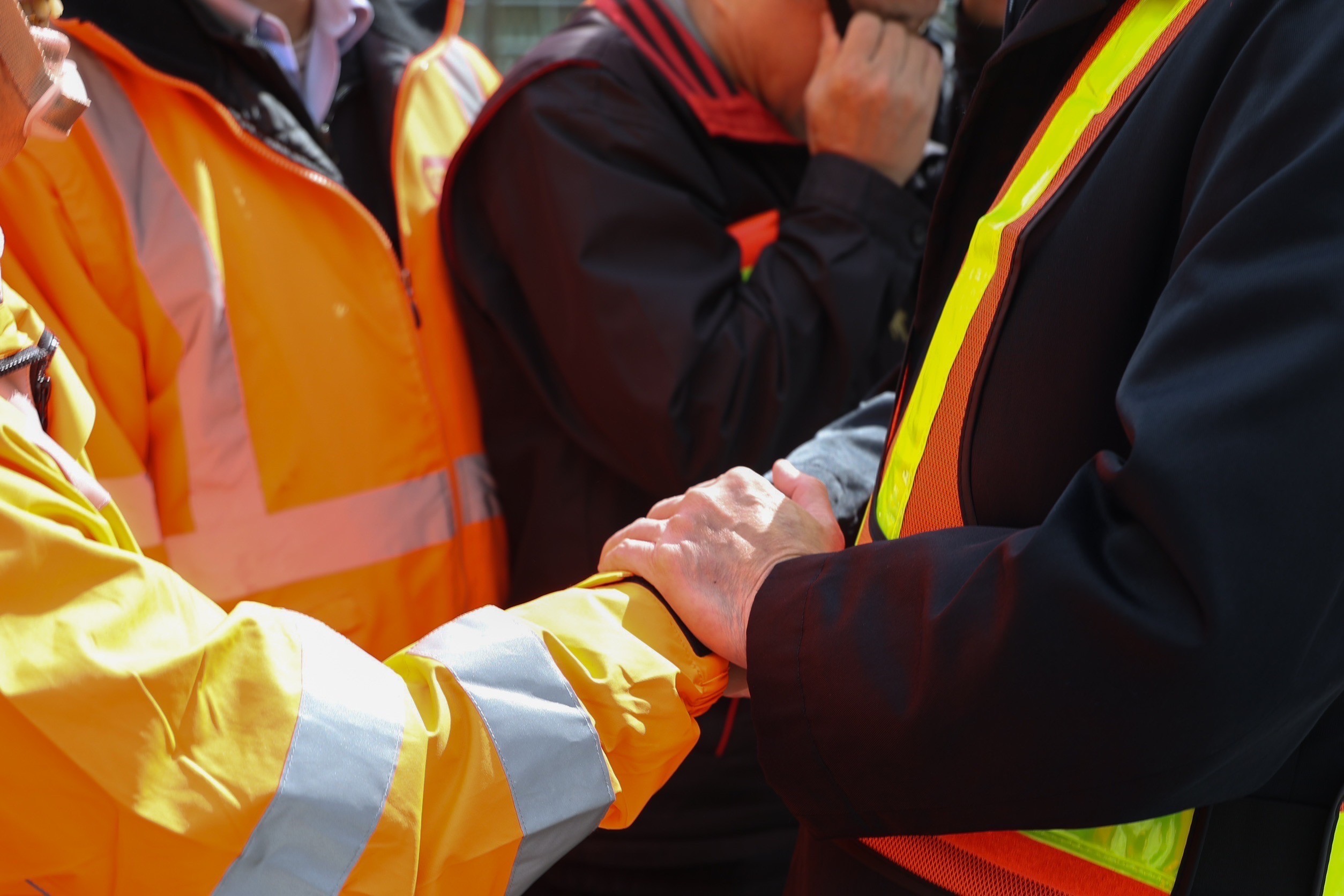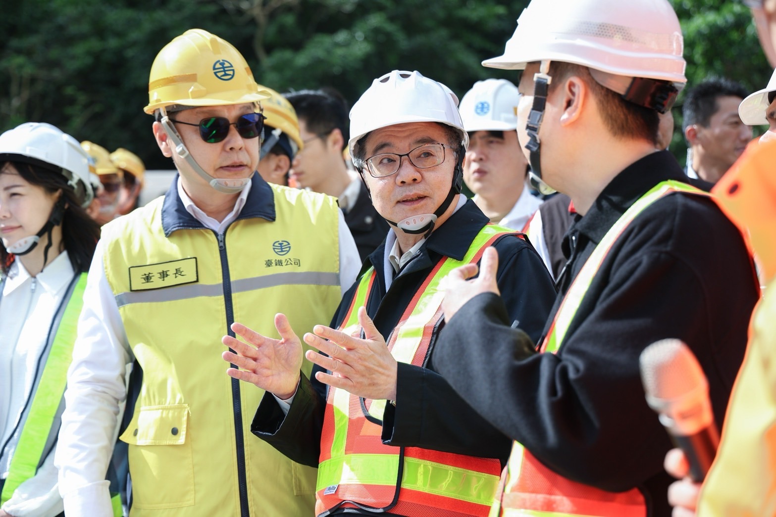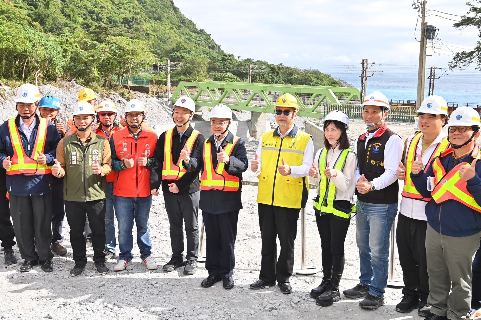 致詞結束後,卓院長偕同行政院李慧芝發言人、交通部陳世凱部長及臺鐵公司杜微董事長等人,在臺鐵花蓮工務處謝曜宇處長解說下,進行現地視察,了解工程執行過程,並與臺鐵公司同仁合影留念。