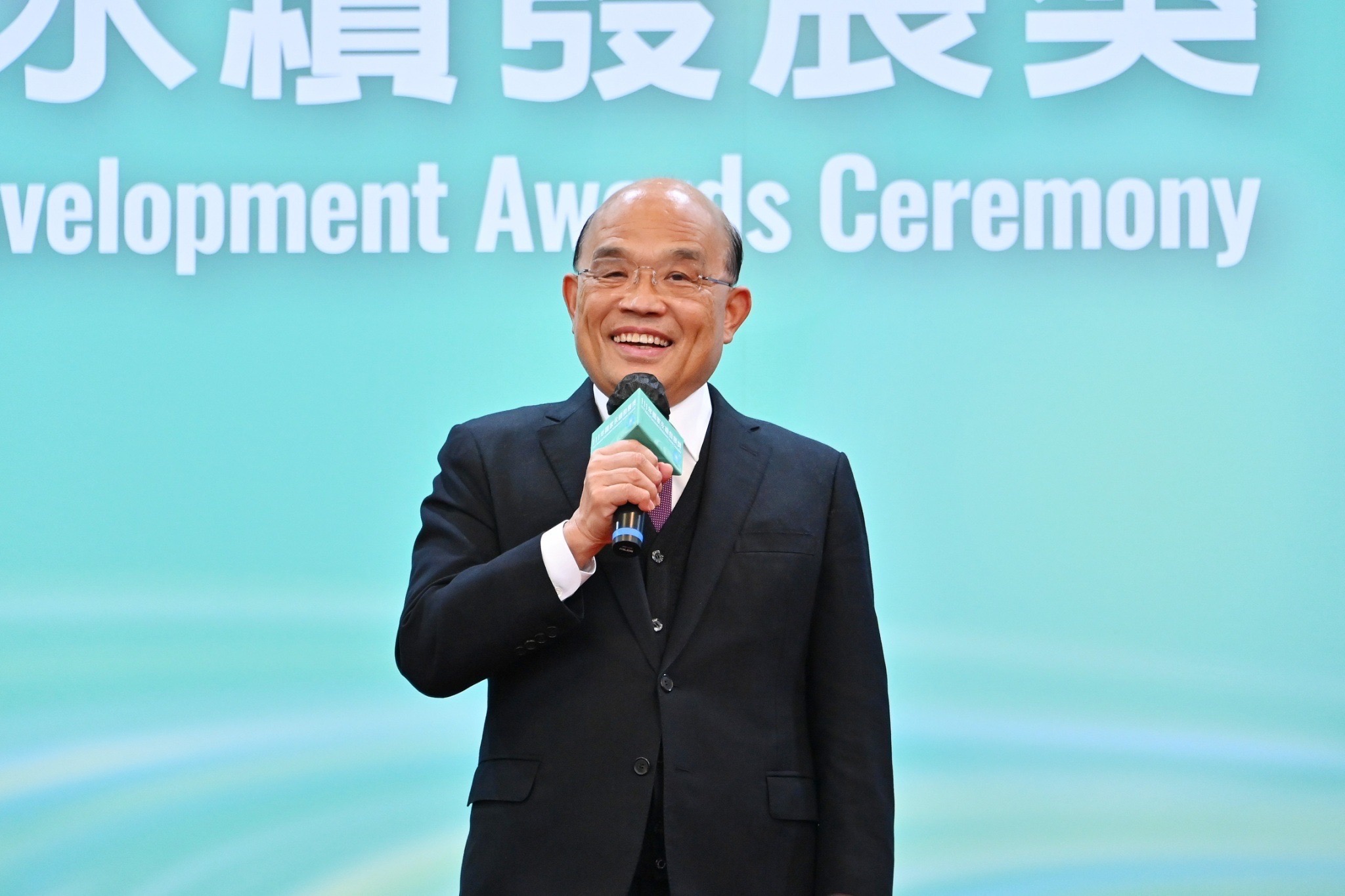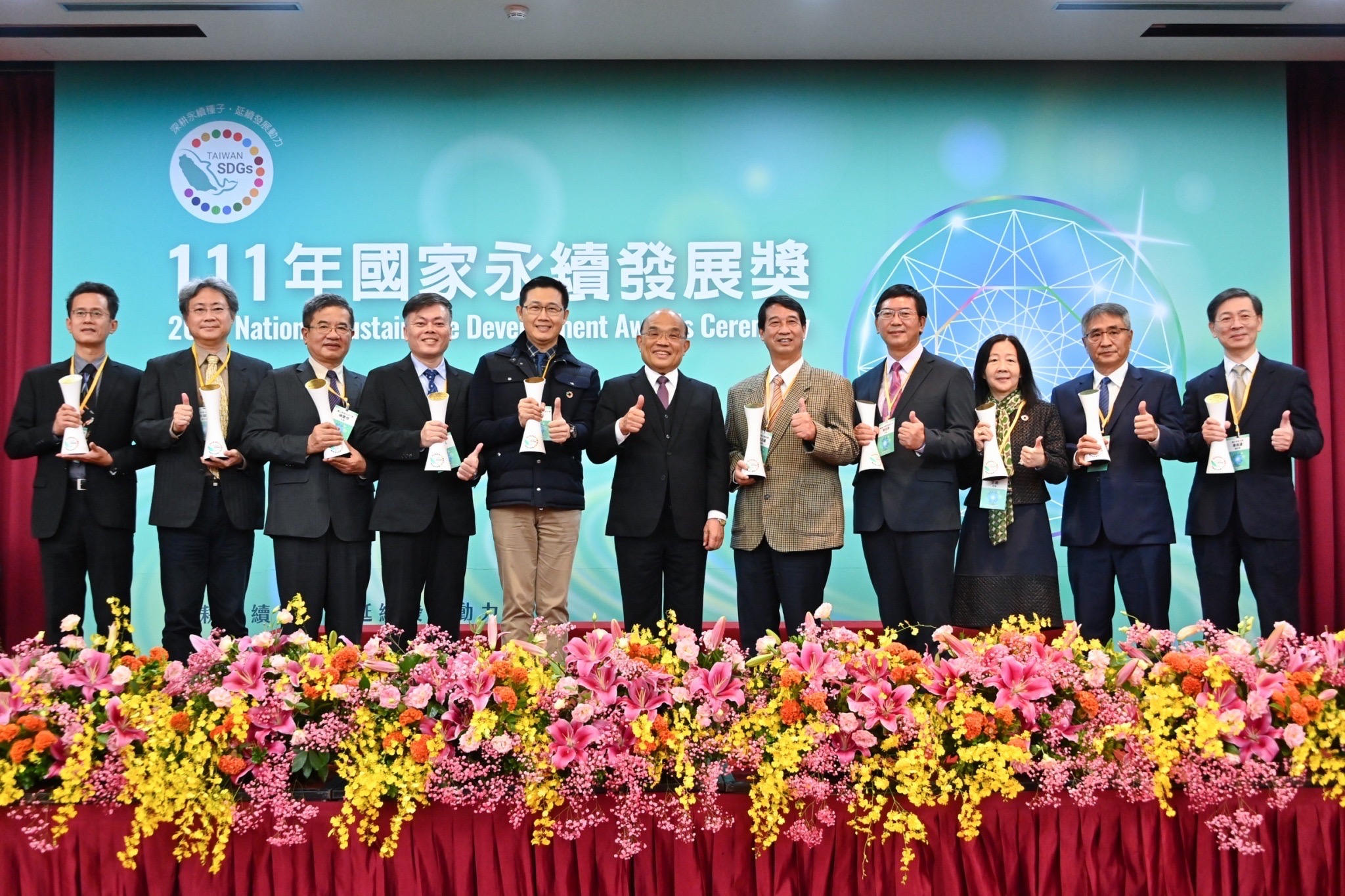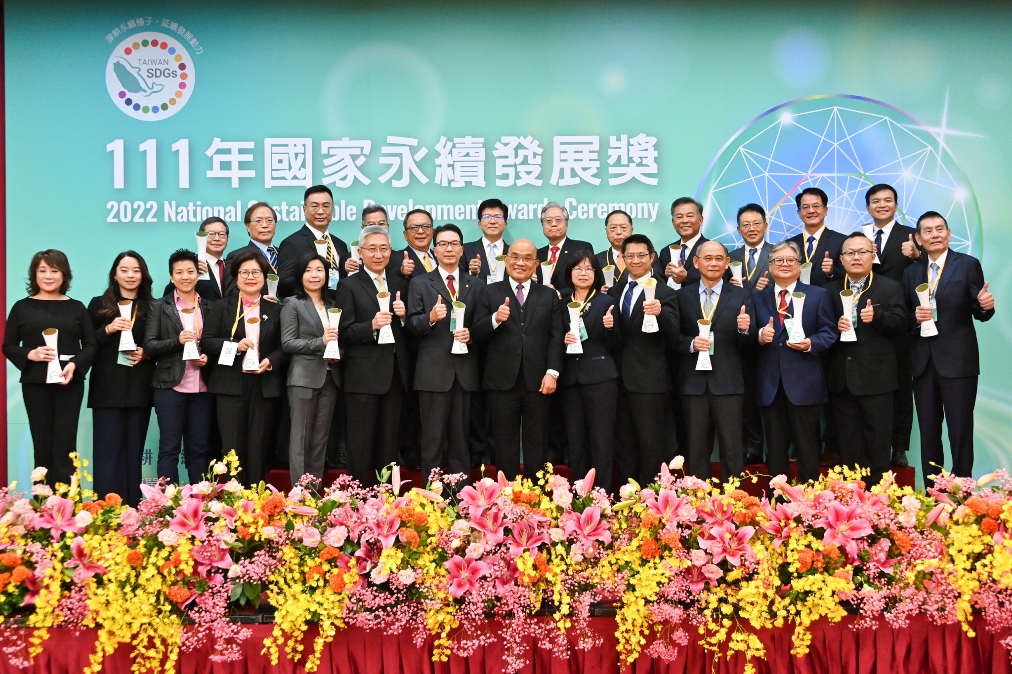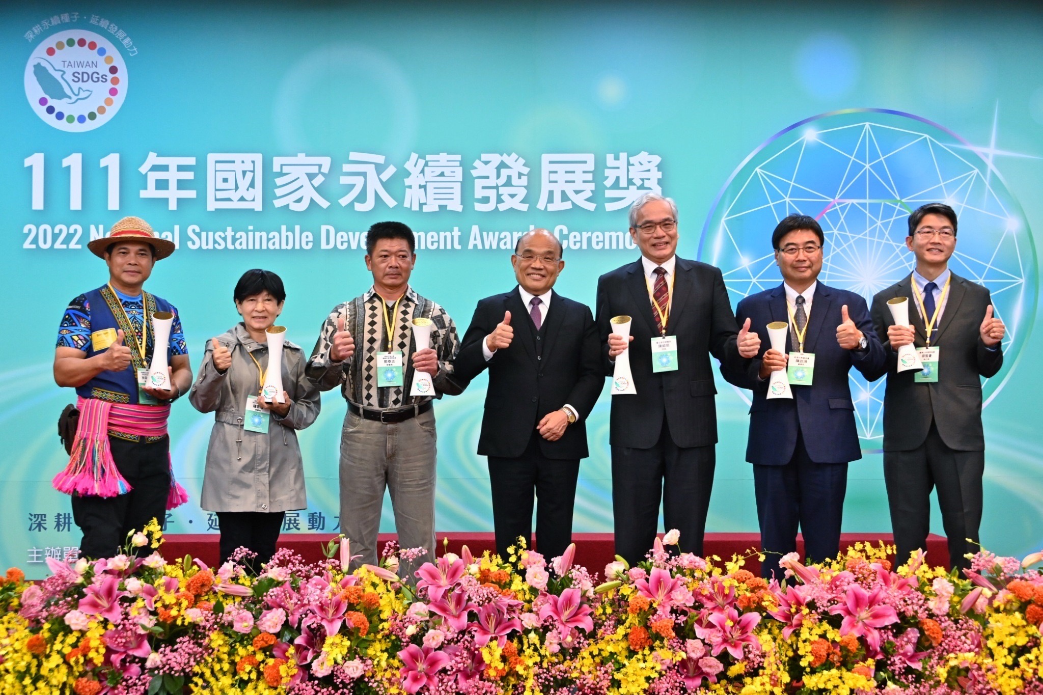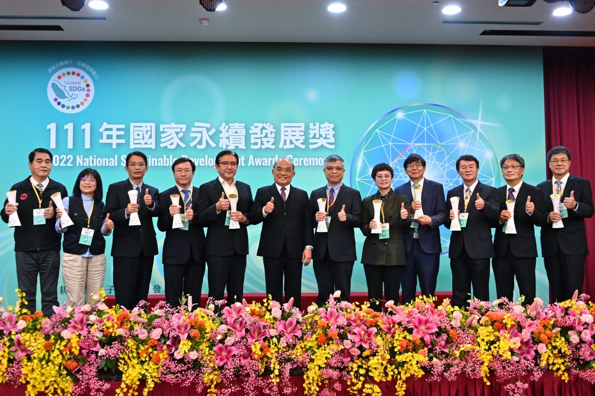 行政院長蘇貞昌今(14)日出席「111年國家永續發展獎頒獎典禮」,親自頒獎予各得獎單位,表揚、肯定及感謝他們對環境永續發展所付出的努力與貢獻,並期勉社會各界以得獎者為典範,共同為環境永續發展努力。蘇院長也強調,為達成蔡英文總統宣示「2050淨零排放」的目標,政府已積極從法制、政策及預算等各方面著手,並勉勵大家更加把勁,努力做到更好。