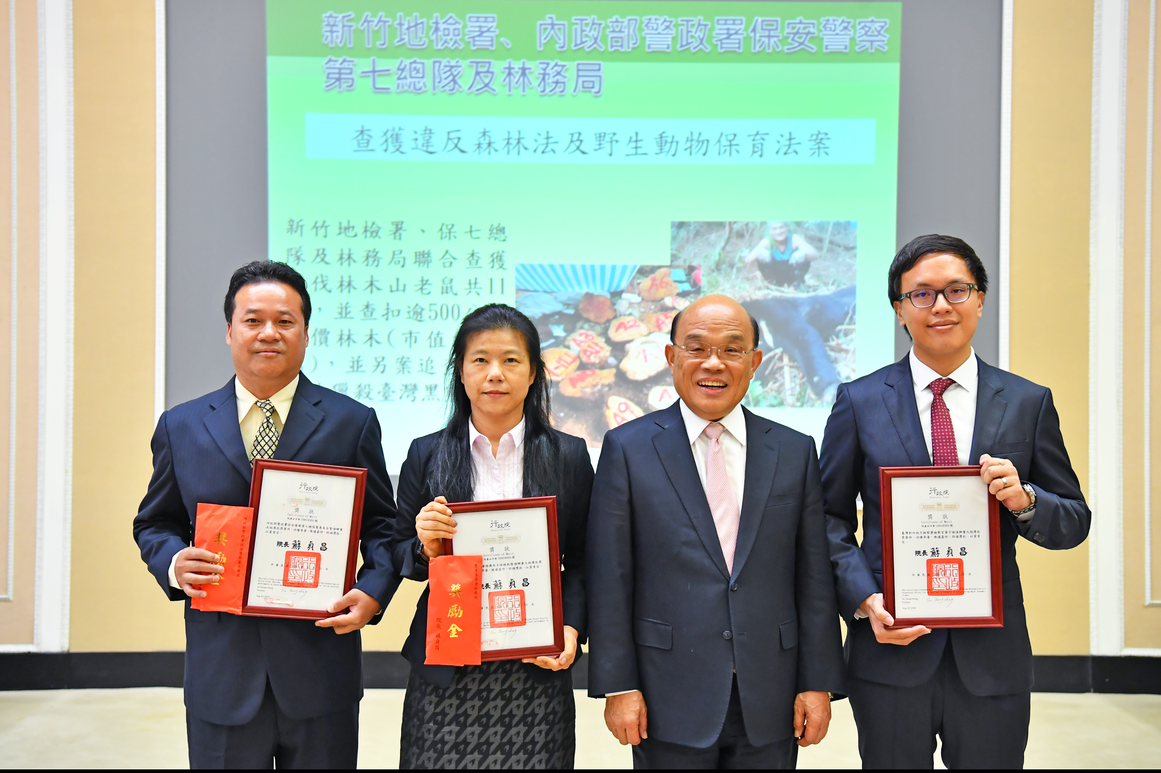 蘇院長期許受獎同仁以今天的獎項為傲,把工作做得更好。院長感謝受獎者讓臺灣的山林得到保護、民眾健康得到保護、經濟振興得到維護。這一切都歸功於年輕、能幹、勇於任事的檢察官、警察、海關、保育人員、巡山員等堅守崗位。院長也鼓勵全國公務人員一起加油,從中央到地方,守好我們安身立命的地方,讓臺灣更安全、國家更有力量、人民更幸福。