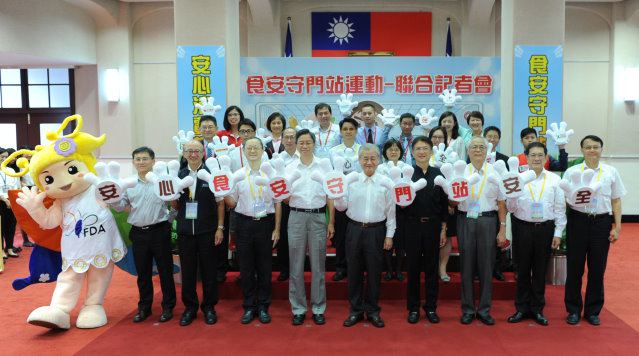 行政院今(20)日舉辦「食安守門站運動聯合記者會」,行政院長毛治國、副院長張善政、食品安全會報委員、部會代表、公協會與11家大型量販通路業者等齊聚一堂共同響應注重食品安全自主管理。