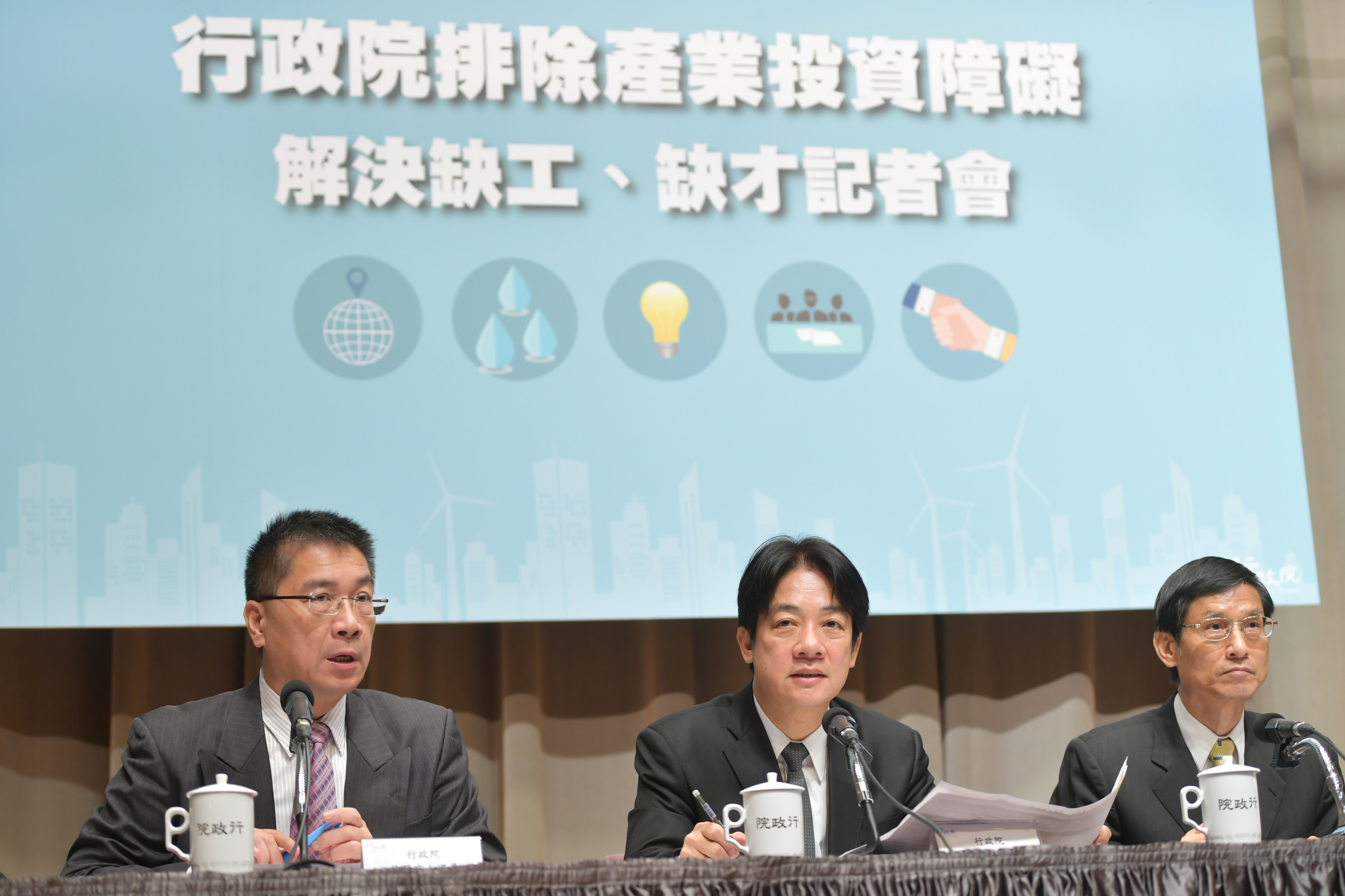 為排除投資障礙,解決產業五缺的缺工、缺才問題,行政院長賴清德今(10)日接續召開記者會,說明相關對策及具體措施。賴院長表示,行政院提出「留才、攬才、育才」三大政策方向,解決產業人才不足的問題。此外,目前台灣的失業率為3.77%,為因應產業投資及經濟持續發展所面臨的產業缺工問題,政府也提出「媒合就業,開發勞動力;改善低薪,創造友善職場;產學雙贏,縮短學用落差」三大改善對策。