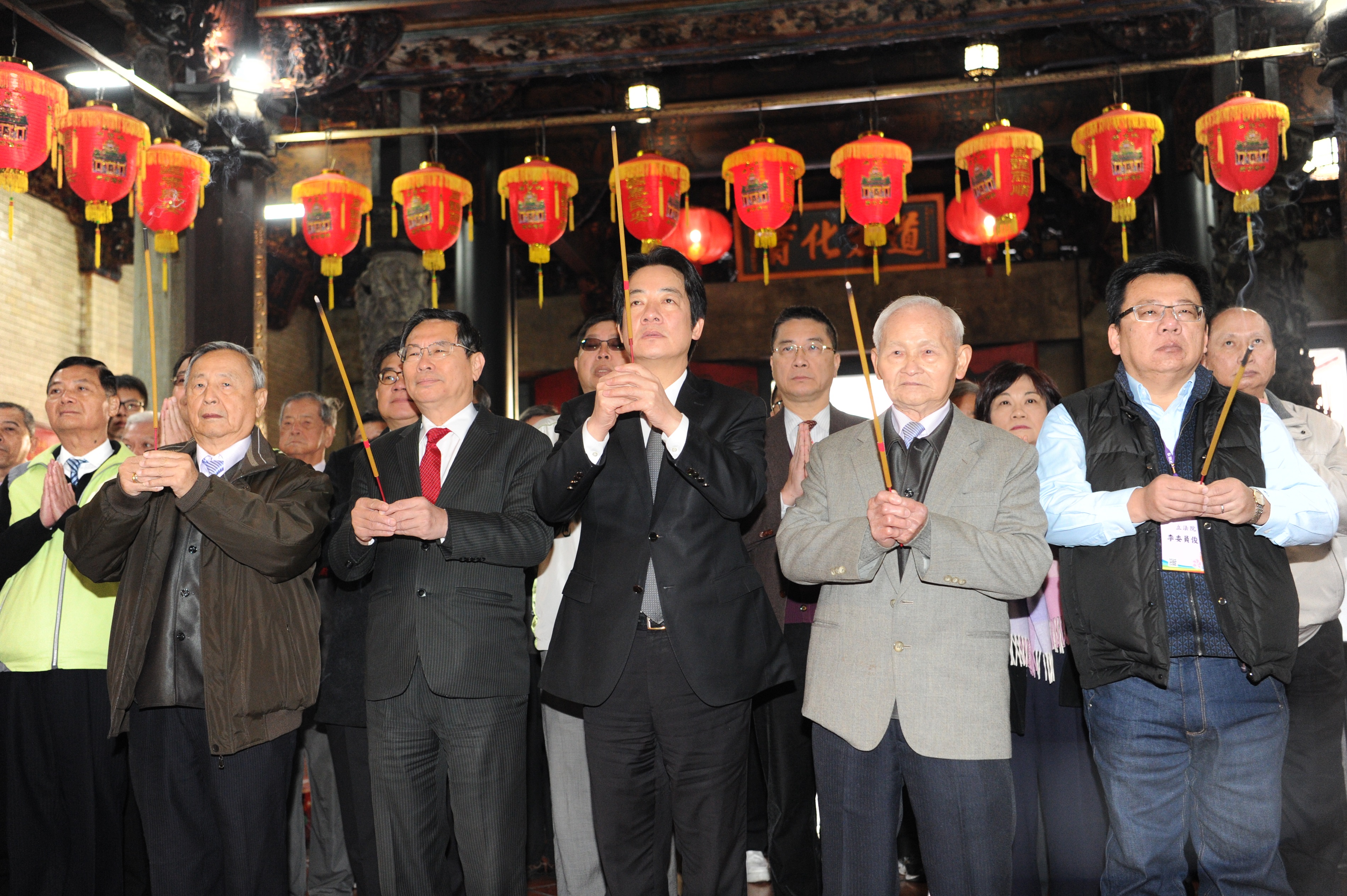 賴院長在參拜祈福時表示,昨(12)日行政團隊與嘉義市政府進行座談,前瞻基礎建設有助落實台灣下一階段基礎建設。此外,涂醒哲市長用心推動市政,如嘉義市參加國際「智慧城市論壇」(ICF),首次參選即入圍第21名,去(106)年更獲評選為全球第7大智慧城市。全台22個縣市中,也唯有嘉義市政府設置「智慧科技處」。