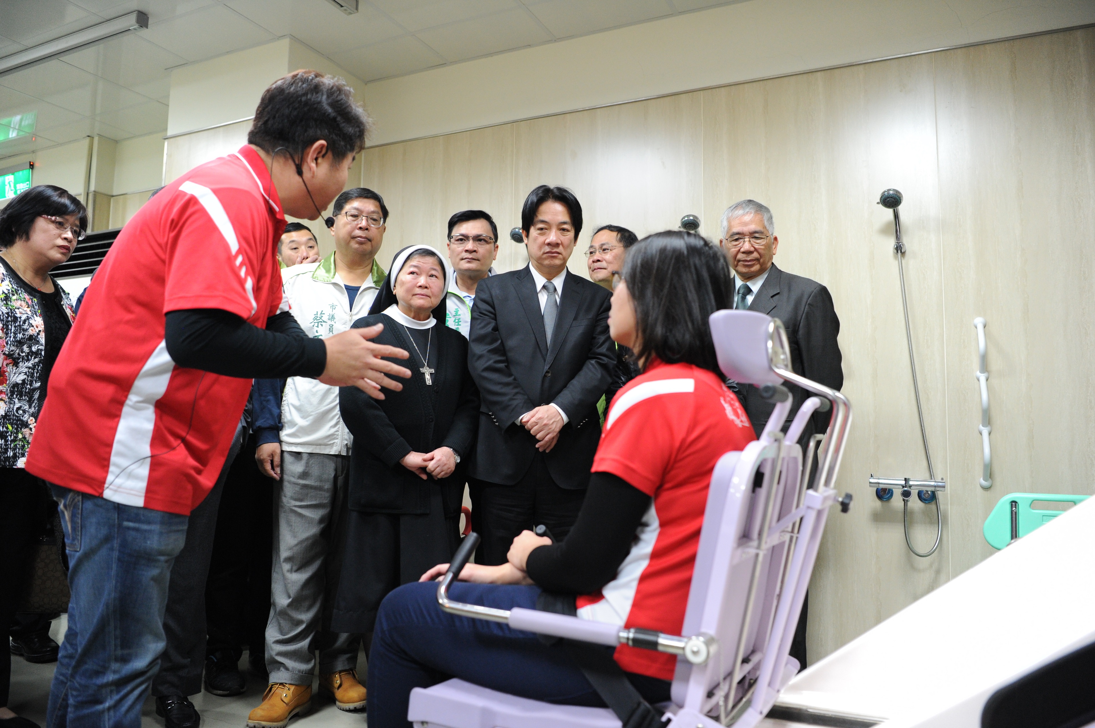 賴院長在參訪「長照2.0據點-聖愛家園」(全台首創長輩沐浴福址教室)時表示,聖母社會福利慈善事業基金會提供全台首創長輩沐浴福祉教室,台南市也向該基金會學習。沐浴車的服務,讓社會許多臥病在床的患者可沐浴清潔,除了帶來心理舒適及醫療效果,也讓患者感受到溫暖與愛,值得推廣。