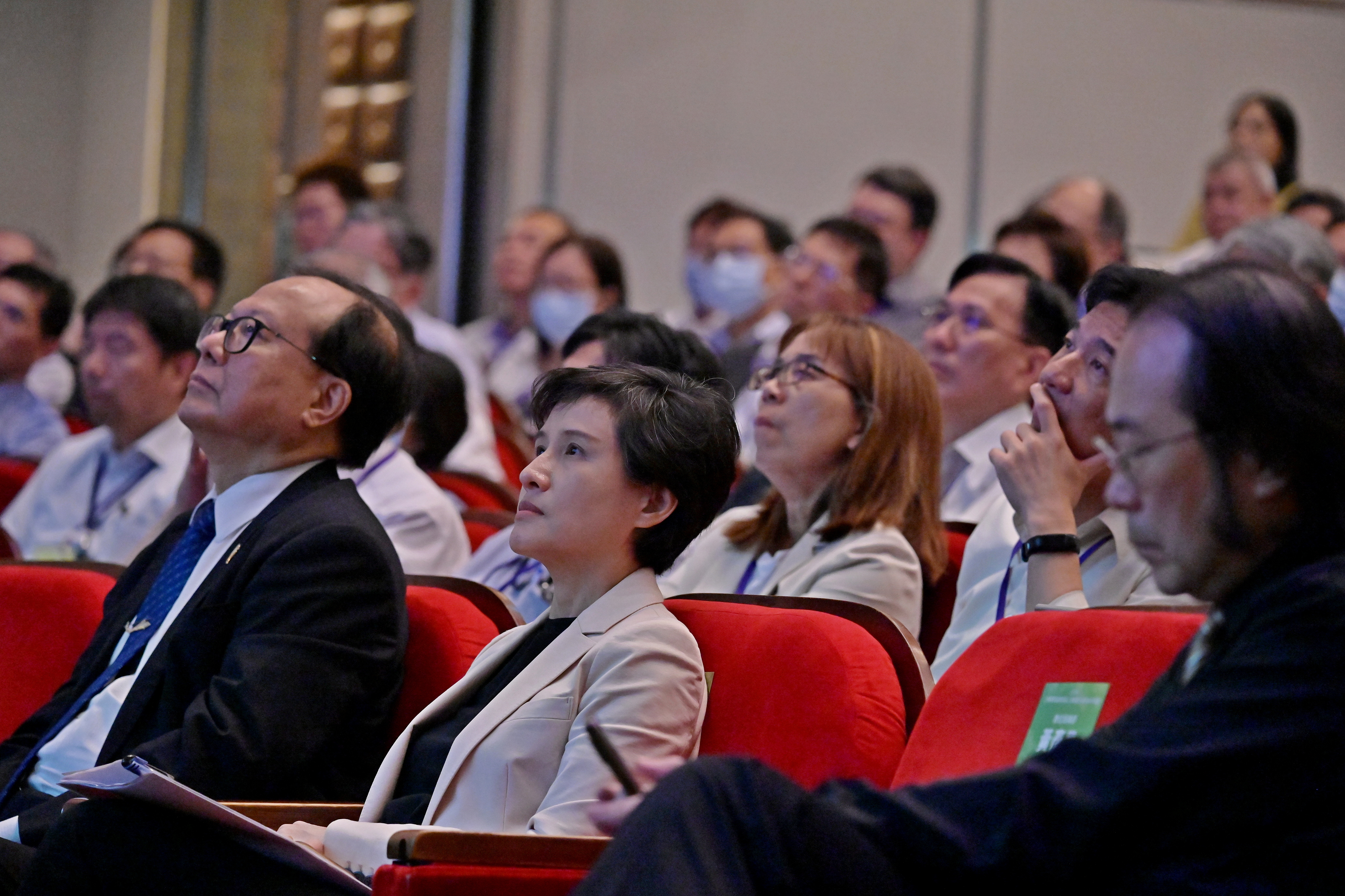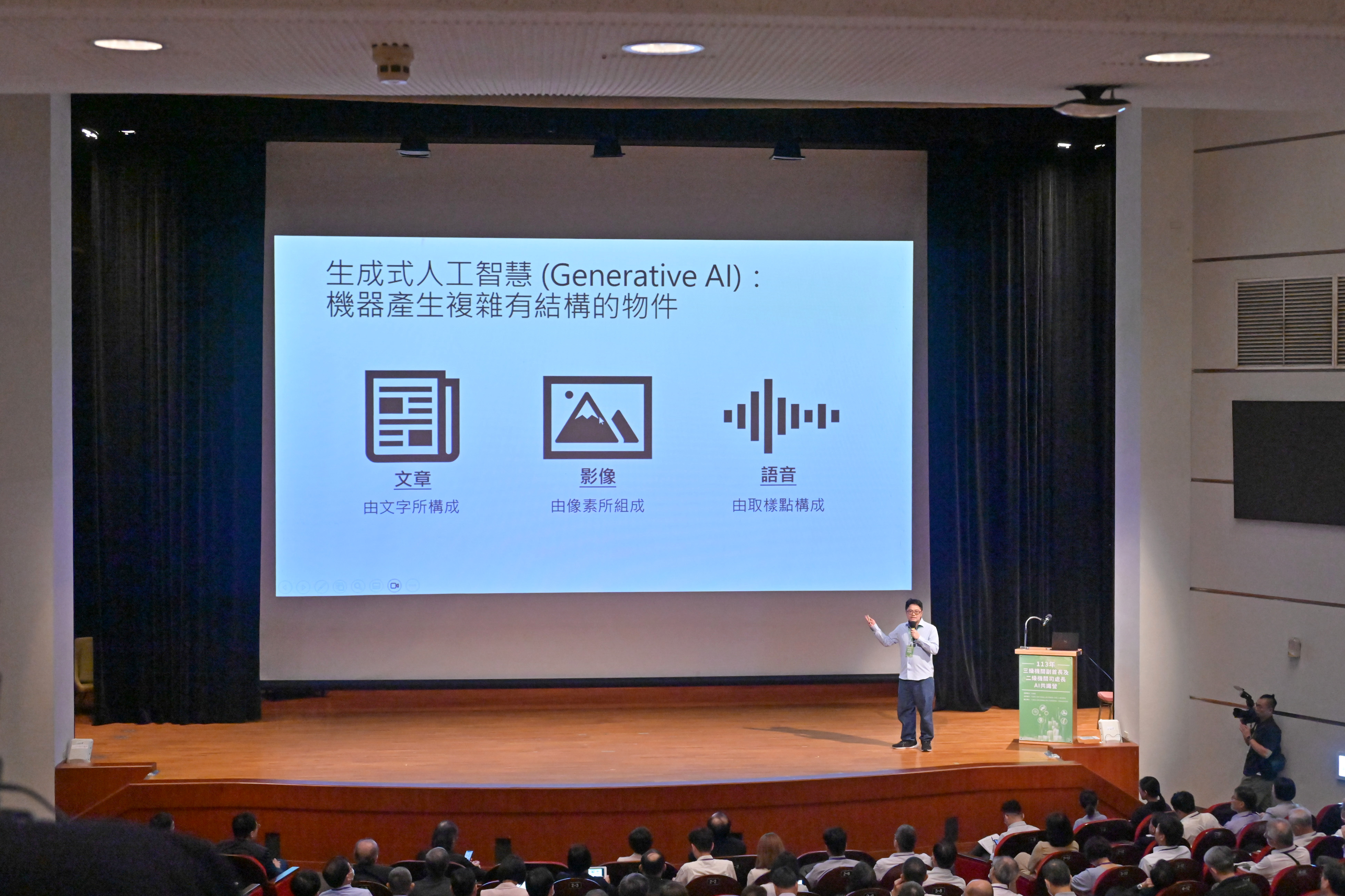此行,鄭院長抵達後,特別手持「共創智慧未來」手板,和今日參與共識營的三級機關副首長及二級機關司處長等學員一同在座位上合影留念。致詞結束後,鄭副院長也與學員們一起聆聽國立臺灣大學電機工程學系李宏毅教授針對「AI對國家競爭力的機會與挑戰」主題所發表的專題演講。