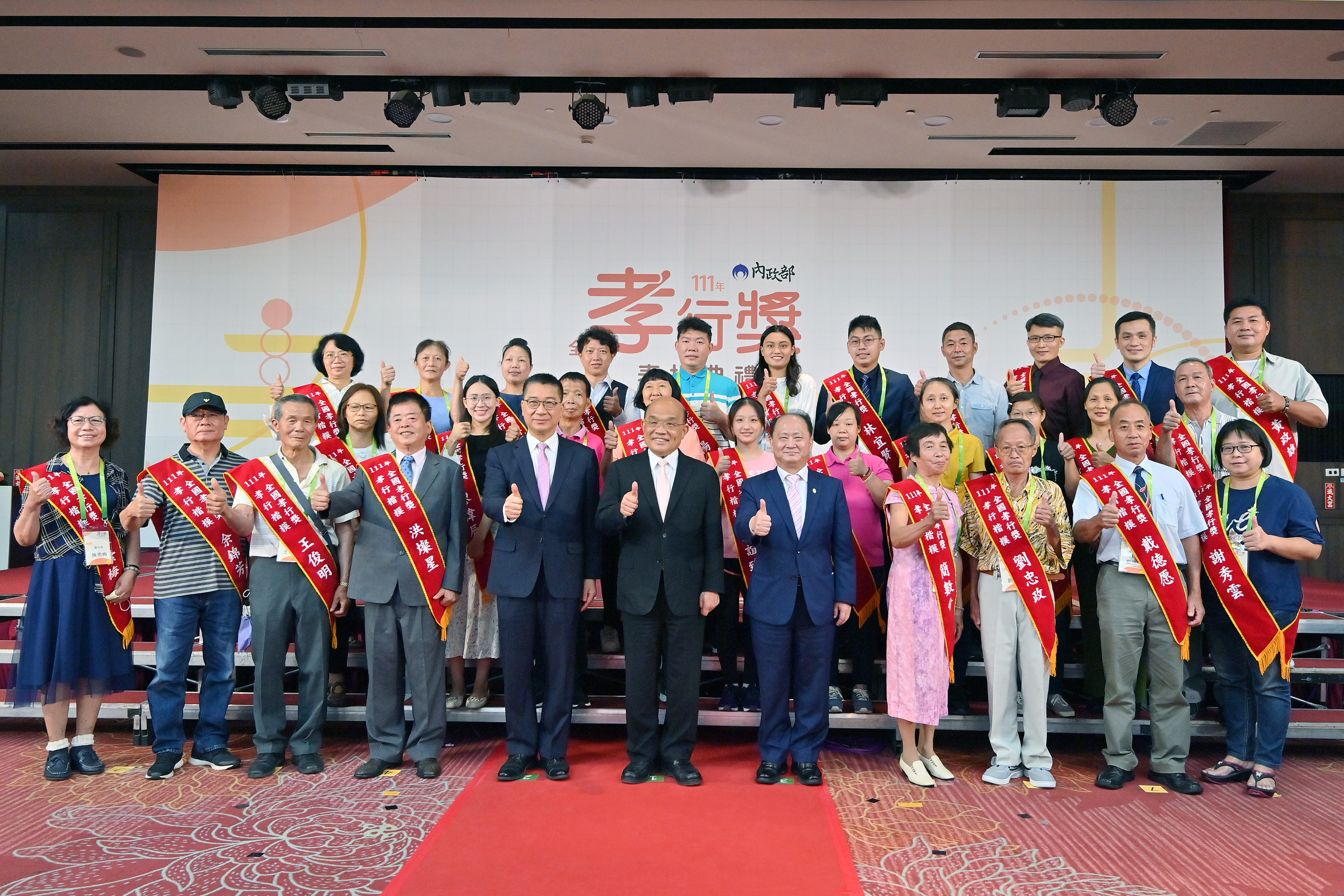 行政院長蘇貞昌今(30)日出席「111年全國孝行獎表揚典禮」,親自頒發獎座予各獲獎楷模,肯定及感謝他們長期盡孝,希望全國民眾皆能以得獎者為典範,讓孝行普天下,並讓臺灣成為充滿孝道、溫暖的國家。院長也強調,蔡英文總統十分重視高齡長者的長照服務,長照經費已從2016年上任時的47億元,大幅成長到今(2022)年600多億元,而明(2023)年度長照經費更將成長到近650億元,同時照顧體系據點、長照服務人力及獲得長照服務的人數亦大幅增加,希望讓長者獲得照顧,並減輕照顧者的負擔。