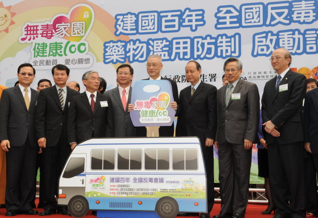 衛生署今日在行政院前廣場舉辦「無毒家園、健康100」破冰列車記者會。吳院長在致詞中表示,數據顯示毒品不僅只存在於社會上,連校園內也感受到相當大的威脅。為使台灣建立一個真正幸福、健康的無毒家園,吳院長呼籲全面、全民、全力的反毒及防毒。