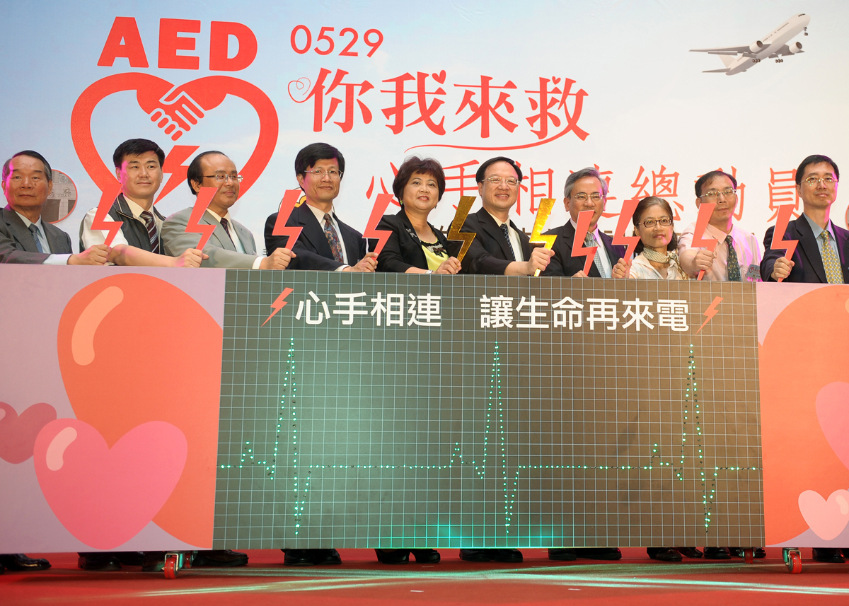 為提供國人尊重生命、安心友善環境,並了解政府對於公共場所設置自動體外心臟電擊去顫器政策的決心,行政院長江宜樺今(29)日在衛生署長邱文達的陪同下出席在台北車站所舉辦的「0529你我來救,心手相連總動員—全面推動公共場所設置AED宣誓記者會」。