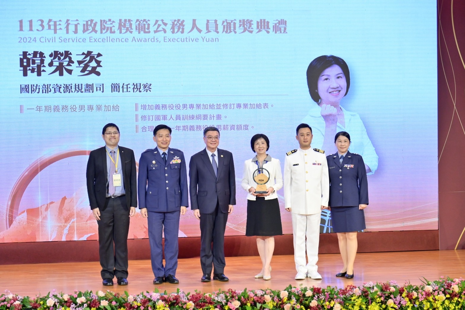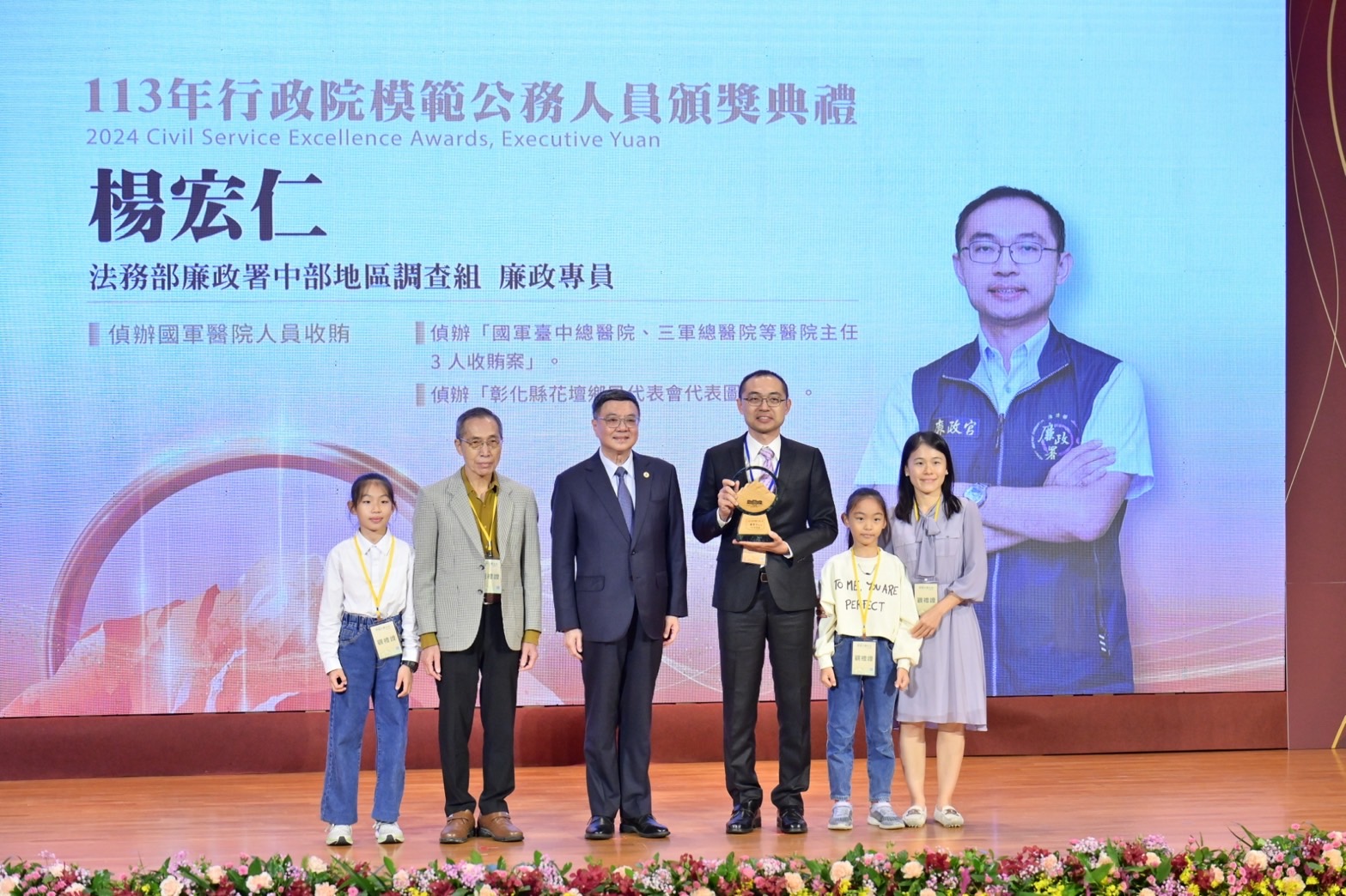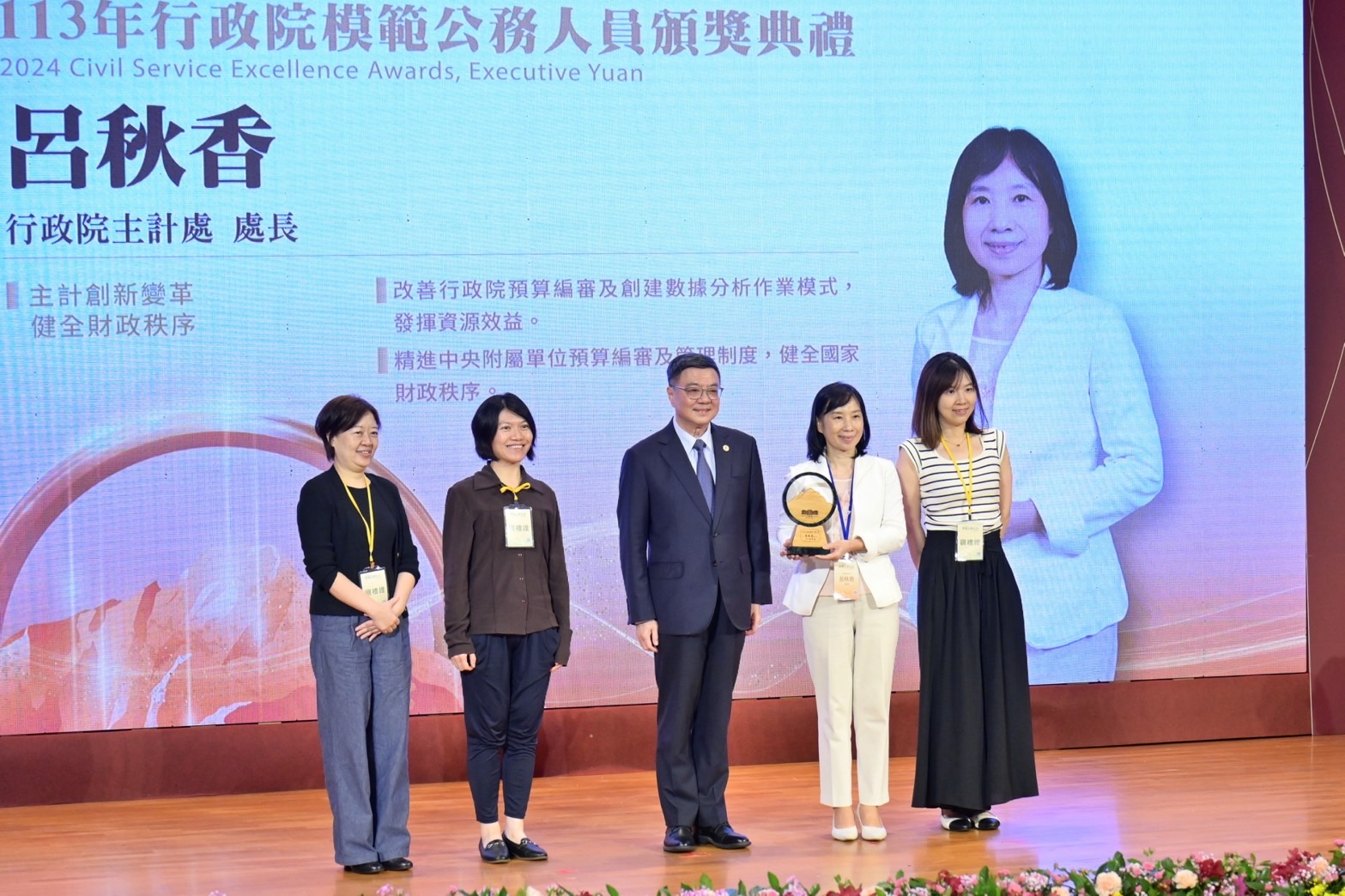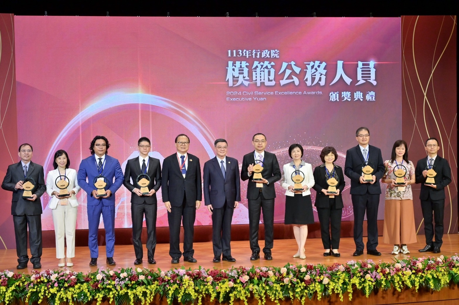 卓院長說,他仔細看了所有獲獎者的得獎事蹟,其中臺南市政府觀光旅遊局陳汶慈股長認真籌辦「2024台灣燈會在臺南」,廣受好評,並創造臺南夏日濱海觀光活動品牌,打響「將軍吼」音樂節知名度;嘉義縣政府農業處張建成科長致力推動漁業創新及智慧養殖漁業,運用科技強化漁業韌性及調適能力,達到省功節能,也減少風險與災損,並吸引青年從事漁業;環境部蔡孟裕主任秘書協助研訂全國「空氣污染防制方案」,針對各項污染源提出具體措施,4年內要投入511億元,同時也攜手各機關推動「濁水溪揚塵防制及改善行動方案」;行政院交通環境資源處張世傑科長積極協調及辦理計畫審議作業,順利完成52項重大交通建設計畫核定,總建設經費達6,700億元;此外,行政院主計總處公務預算處吳銘修專門委員綜理中央政府總預算案編審作業,並撰寫行政院長赴立法院預算報告,讓社會大眾清楚知道政府編製預算的過程與精神。