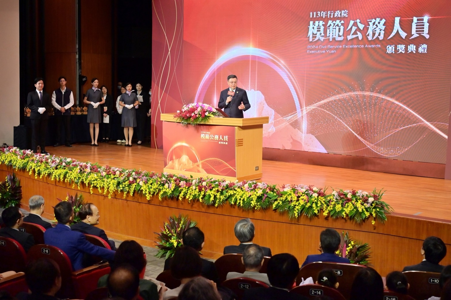 行政院長卓榮泰今(13)日出席「113年行政院模範公務人員頒獎典禮」,頒獎表揚35位獲獎模範公務人員的貢獻,並期許大家保持敏銳,隨時創新進步;秉持「誠意溝通、人民優先」原則,與國會和人民妥適溝通;以及主動傳承,培育下一代公務人員,讓臺灣成為更文明的國家、更公平的社會。