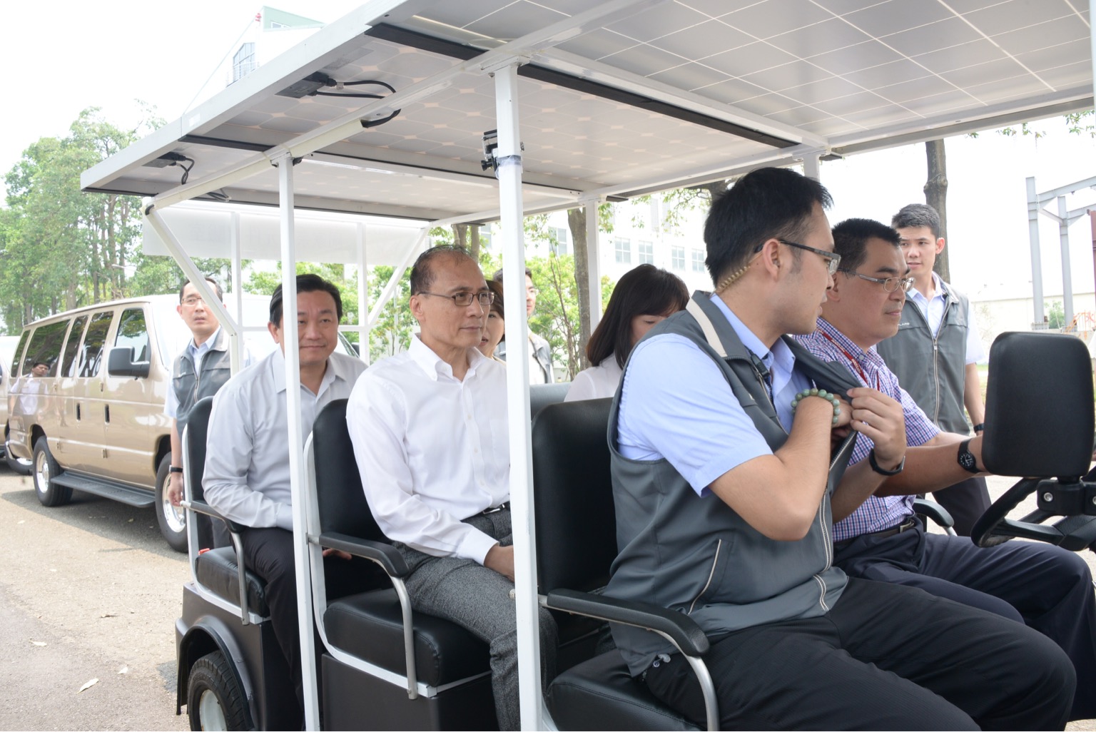 今日林院長先至國震中心參訪高速度長衝程振動台系統及雙軸向測試系統等實驗設施;之後搭乘電動車環繞成大歸仁校區,並至該校區節能固碳/循環經濟實踐場域參訪二氧化碳捕獲及爐渣固碳技術、多元燃料(生質廢料)混燒技術與微藻固碳及水淨化技術相關設施,了解成大將節能固碳技術應用落實循環經濟的研究成果;隨後又前往交大奇美樓參觀沙崙綠能科學城各區說明與進度模型、太陽能步道、太陽能磚、氫能車、產氫機及燃料電池電動機車。