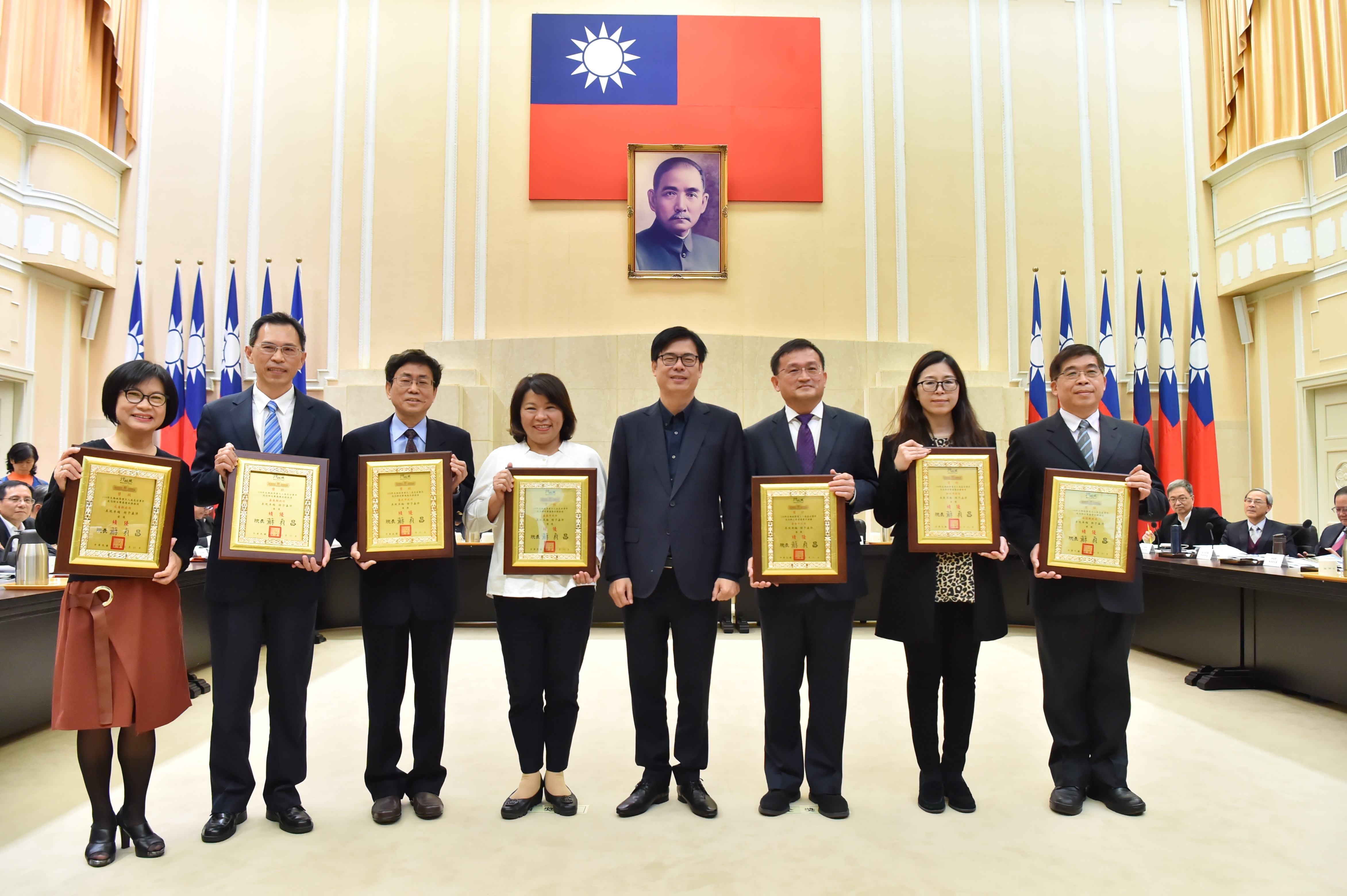 今日會前,陳副院長特別頒獎表揚108年「國家關鍵基礎設施防護演習」、「金華演習」及「生物病原重大人為危安事件或恐怖攻擊兵棋推演」等績優單位,對於受獎機關的積極與辛勞,表達肯定與嘉勉。
