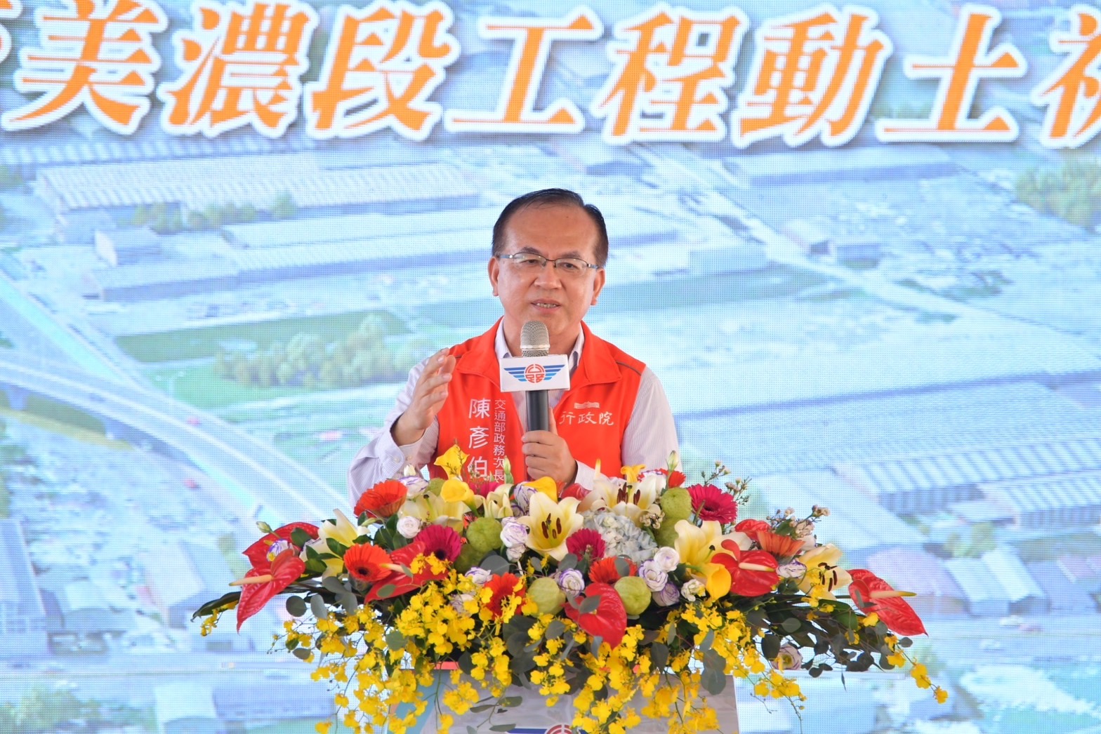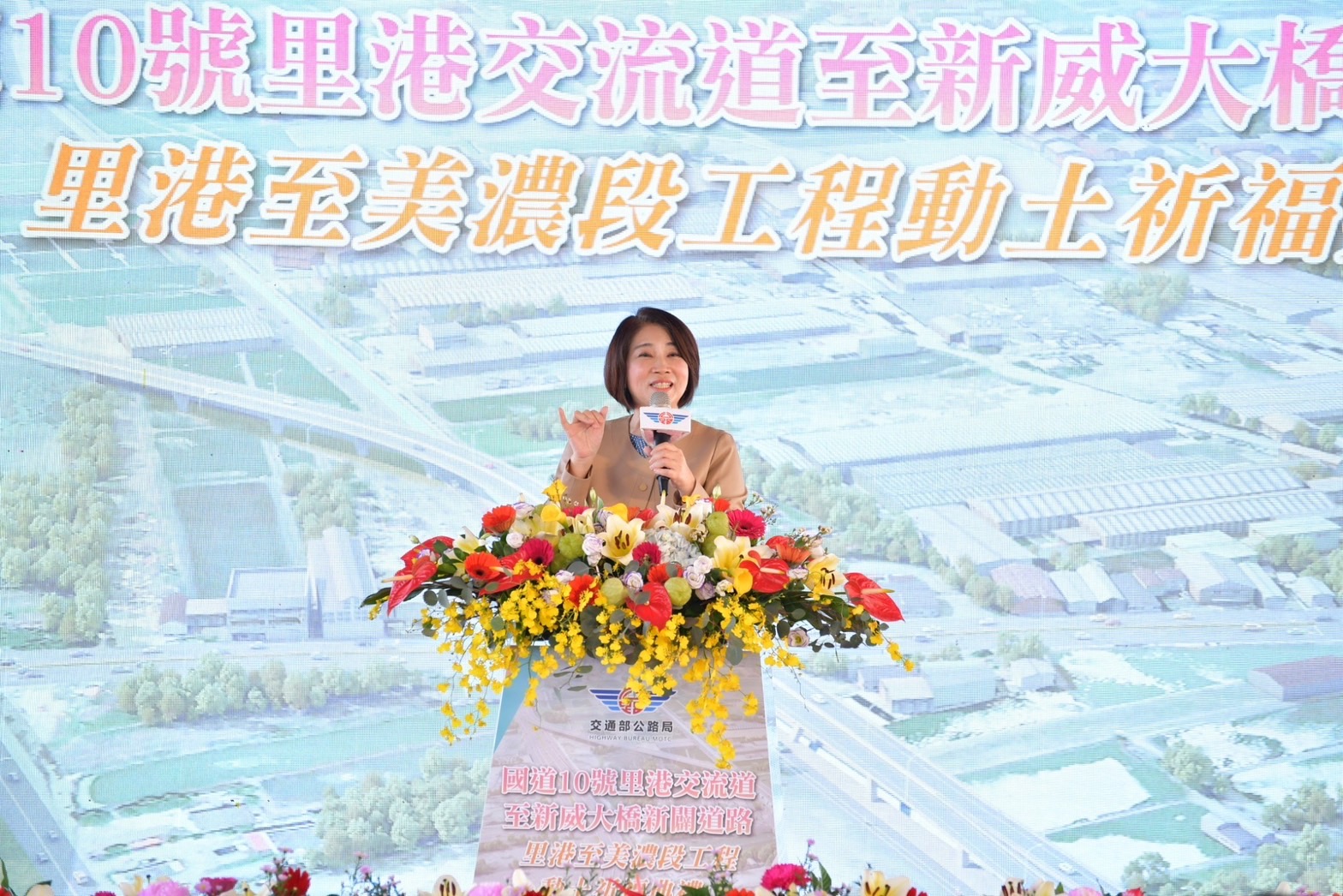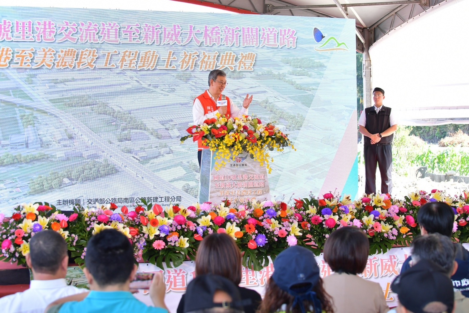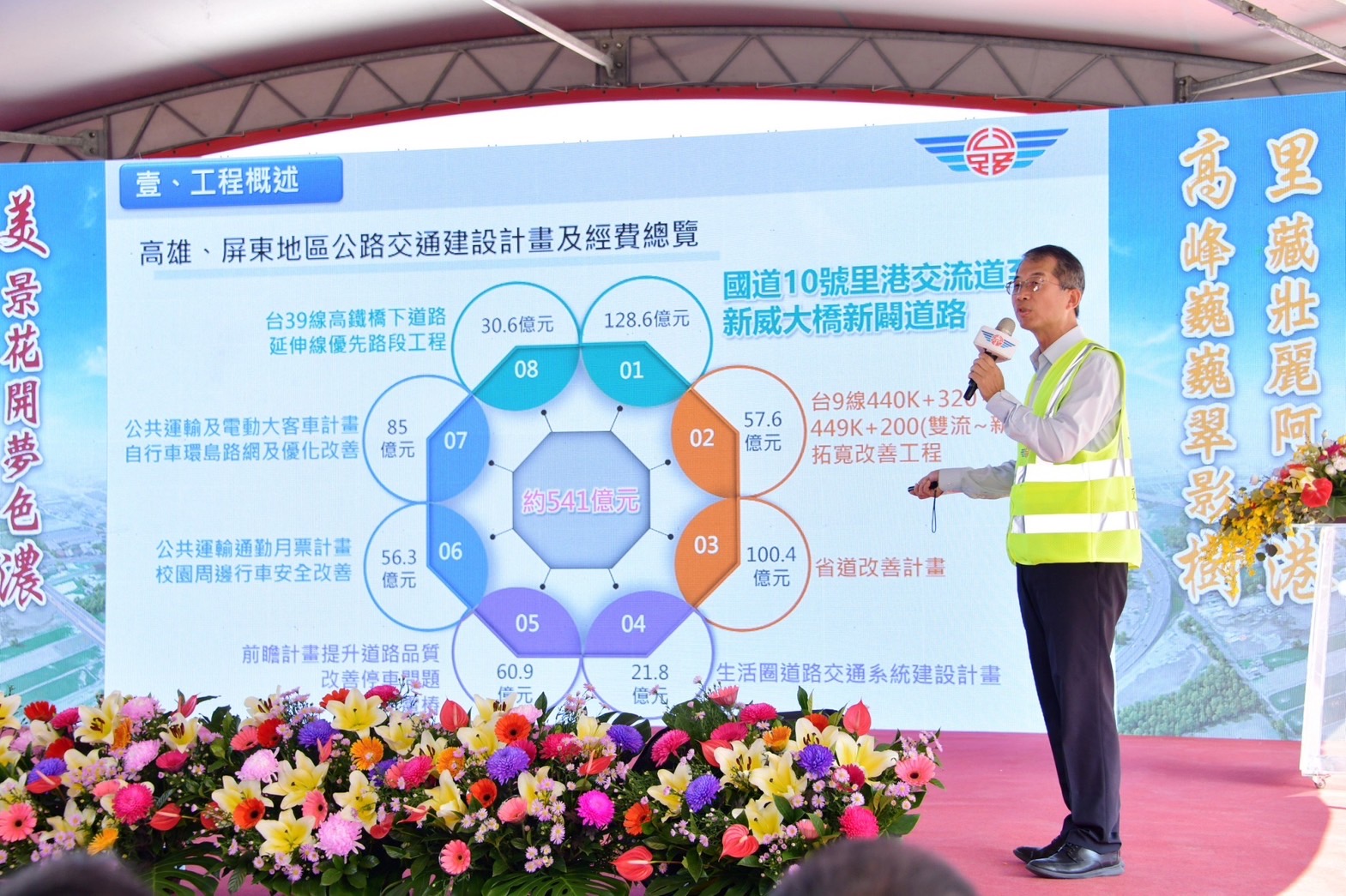 行政院長陳建仁今(12)日前往高雄市出席「國道10號里港交流道至新威大橋新闢道路里港至美濃段工程」動土祈福典禮時表示,政府非常重視高屏地區的交通建設,希望提供地方鄉親安全、舒適、便利的交通服務,而今日動土的里港至美濃段工程預計於2027年9月完工,至於美濃至新威大橋路段工程,目前也已在設計規劃中。院長請有關單位在工程設計方面思考如何採取同步並行方式,以提高施工效率,盼發揮公私協力的力量,使該工程如實、如質並超前完工。