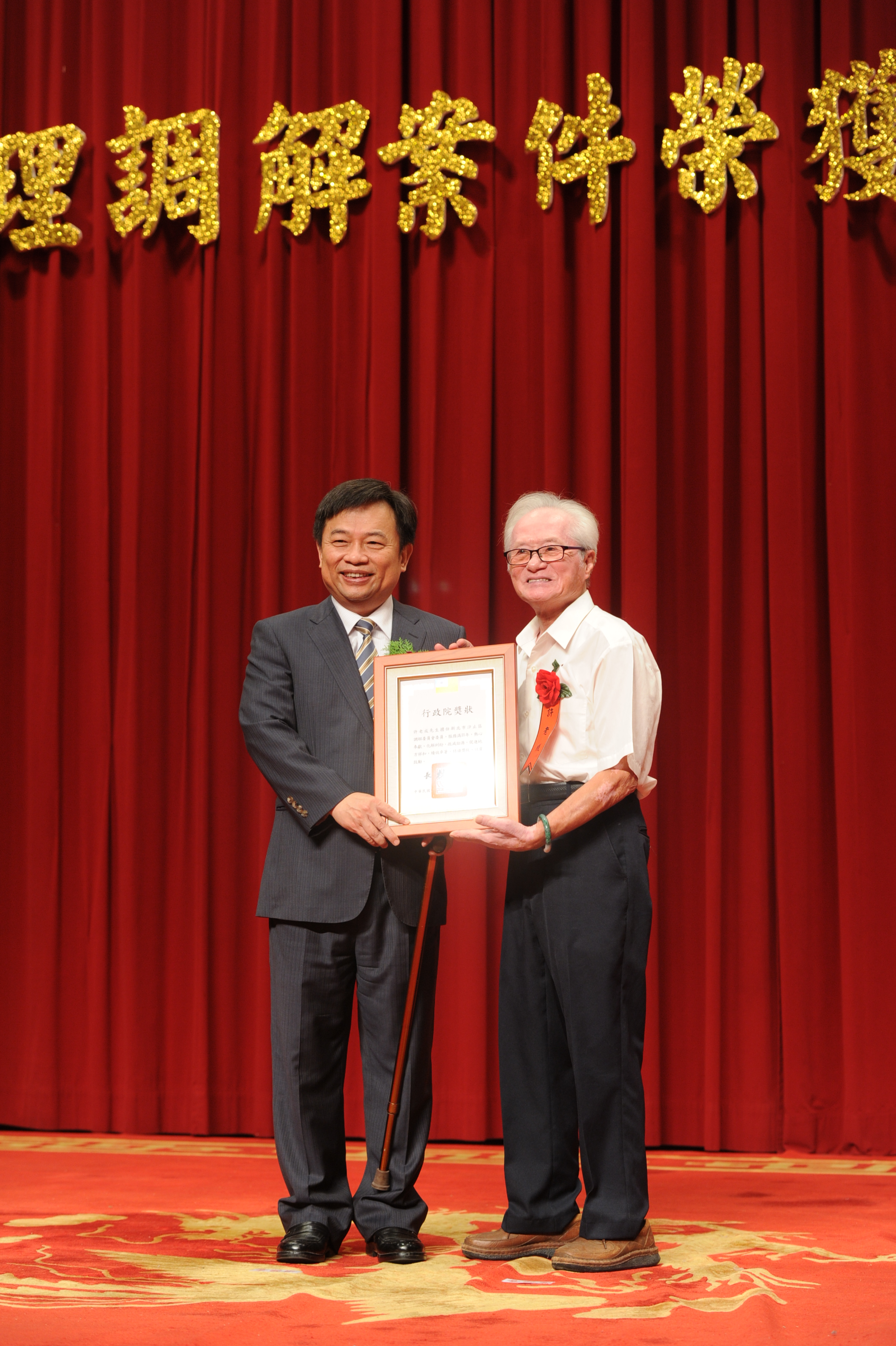 林副院長推崇此次獲獎的293位績優調解人員,均為地方上的調解達人。如雲林縣斗六市高新丁委員屆87歲高齡,拄著柺杖行動不便,仍持續擔負調解工作,熱心的精神令人敬佩;臺南市佳里區劉俊賢主席今年76歲,從事調解工作年資達42年;雲林縣斗六市洪啟文委員同時獲得獨任調解績優人員及服務年資獎(服務20年),104年度調解成立案件數即有968件,調解成功率高達9成以上;另彰化縣彰化市陳大錡委員去年調解1,021件,平均一天3至4件,為全國最高,也有3分鐘調解成功的案例,並多次蟬聯「全國調解王」。