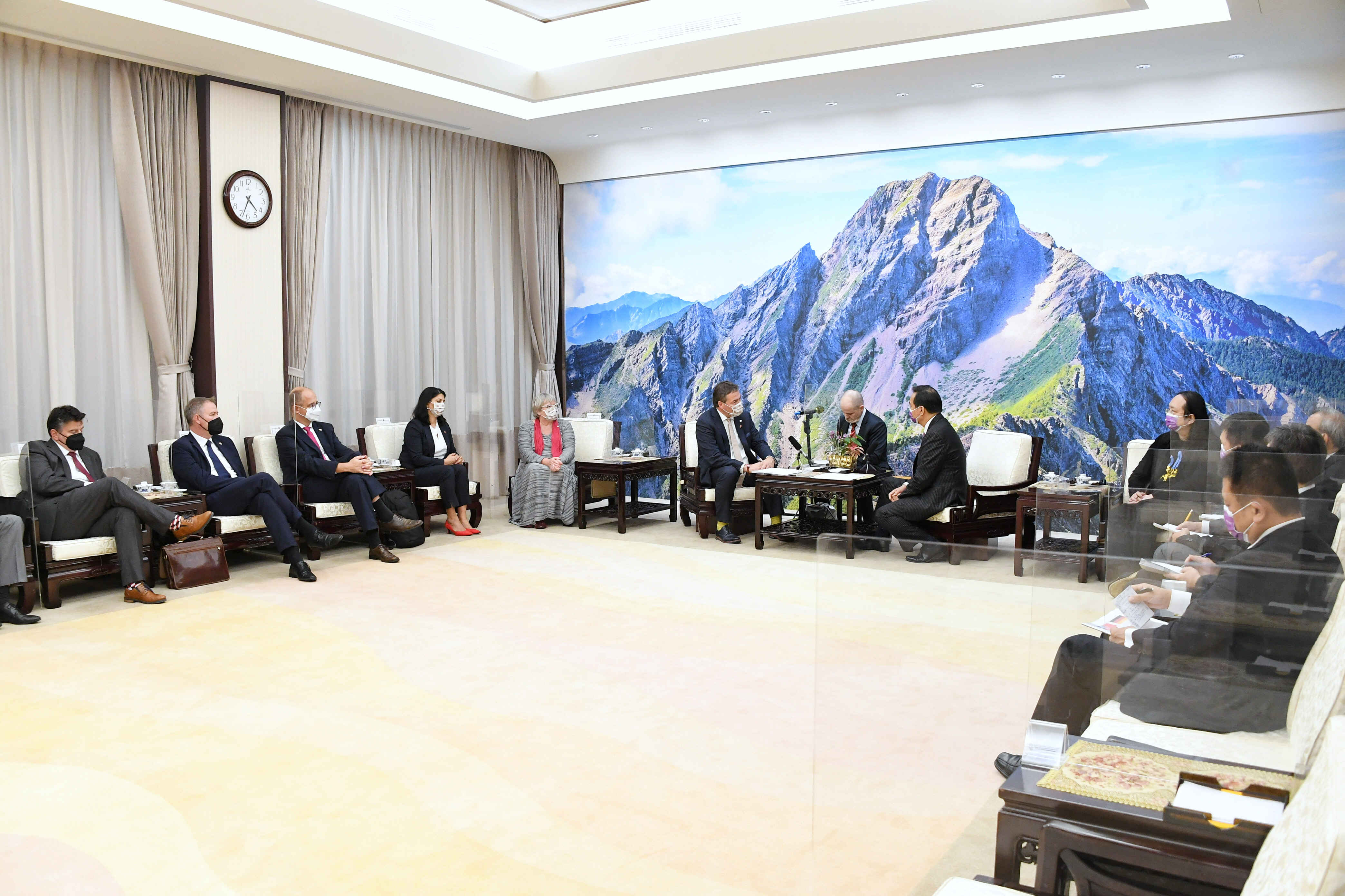 隨後,訪團團長海特(Peter Heidt)議員致詞時表示,他此次有機會率領訪團一行造訪臺灣,深感榮幸;訪團成員主要來自德國國會4大政黨,此跨黨派的訪團不僅具德國國會的代表性,亦展現德國對臺灣的重視。海特議員表示,此行訪臺,除期盼能深化臺德關係外,同時也要讓德國、臺灣人民以及中國瞭解,臺德雙方的合作關係至關重要。