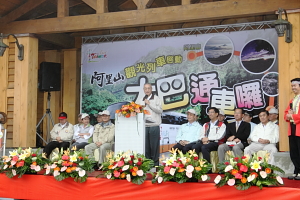 行政院長吳敦義今(25)日出席阿里山公路大巴士暨阿里山森林鐵路恢復通車典禮。吳院長在致詞時強調,在各方考量安全無虞之下,並呼應地方需求及遊客的期待,台18線阿里山公路於今日恢復大巴士通行及阿里山森林鐵路的復駛,將重現阿里山昔日的風采,帶動觀光旅遊的發展。