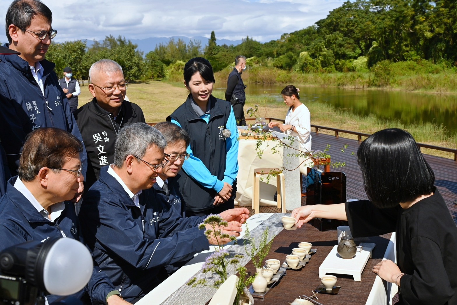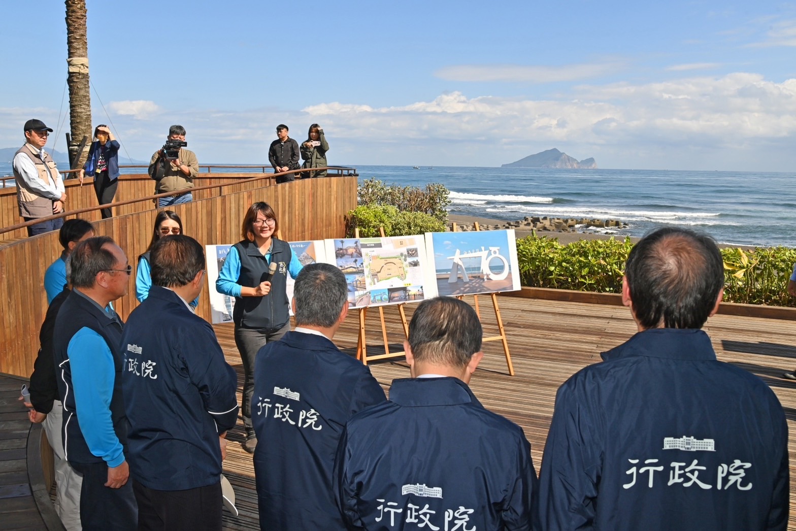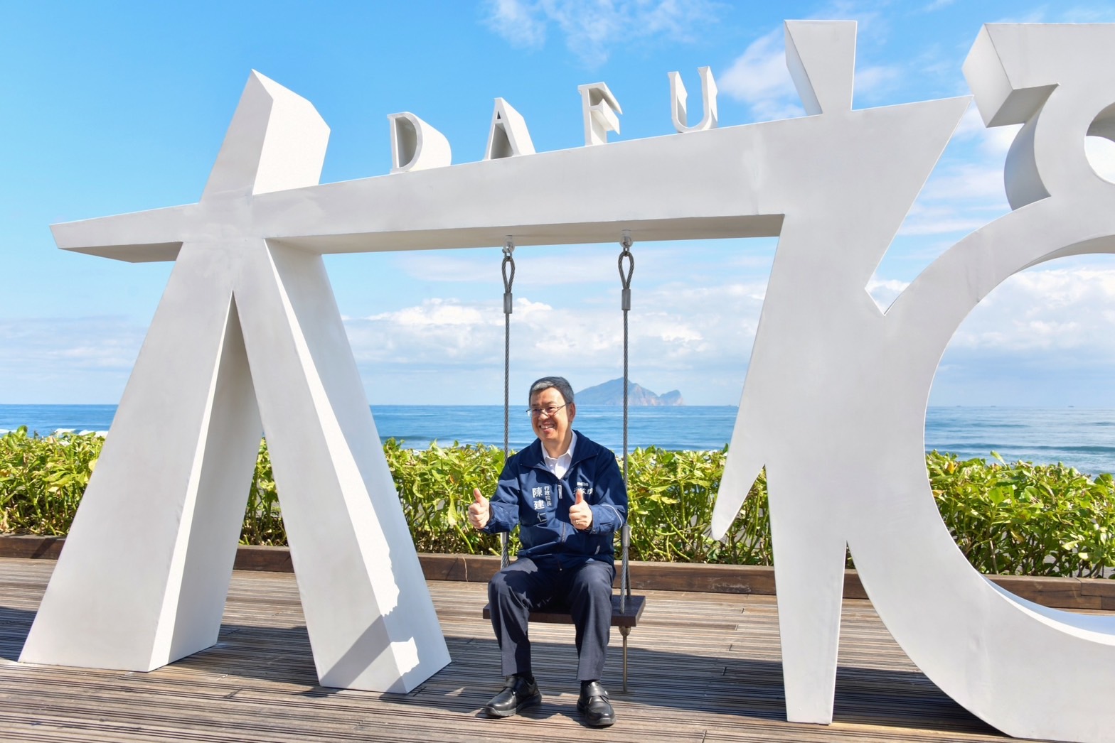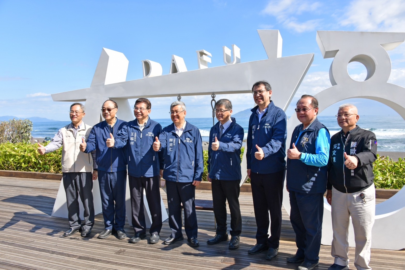 陳院長抵達後,首先聽取交通部觀光署周永暉署長說明「壯圍沙丘生態園區」簡報,並於致詞結束後,現地視察壯圍沙丘生態園區在地文化展、微笑市集,以及鞦韆地景等遊憩設施,了解觀光署推動前瞻建設的執行成果;院長現場也體驗沙丘水岸鞦韆遊憩設施及品嚐宜蘭在地冬山素馨紅茶,並偕同行政院李孟諺秘書長、林子倫發言人、交通部王國材部長、觀光署周永暉署長、東北角及宜蘭海岸國家風景區管理處馬惠達處長及宜蘭縣政府吳志宏秘書長合影留念。隨後,一行人前往沙丘鐵馬廊道觀景平臺(大福觀海旭日觀景臺),在宜蘭海岸國家風景區管理處工務科李承曦科長的解說下,了解大福觀海旭日觀景臺的設計理念,並於觀景臺前合影留念。