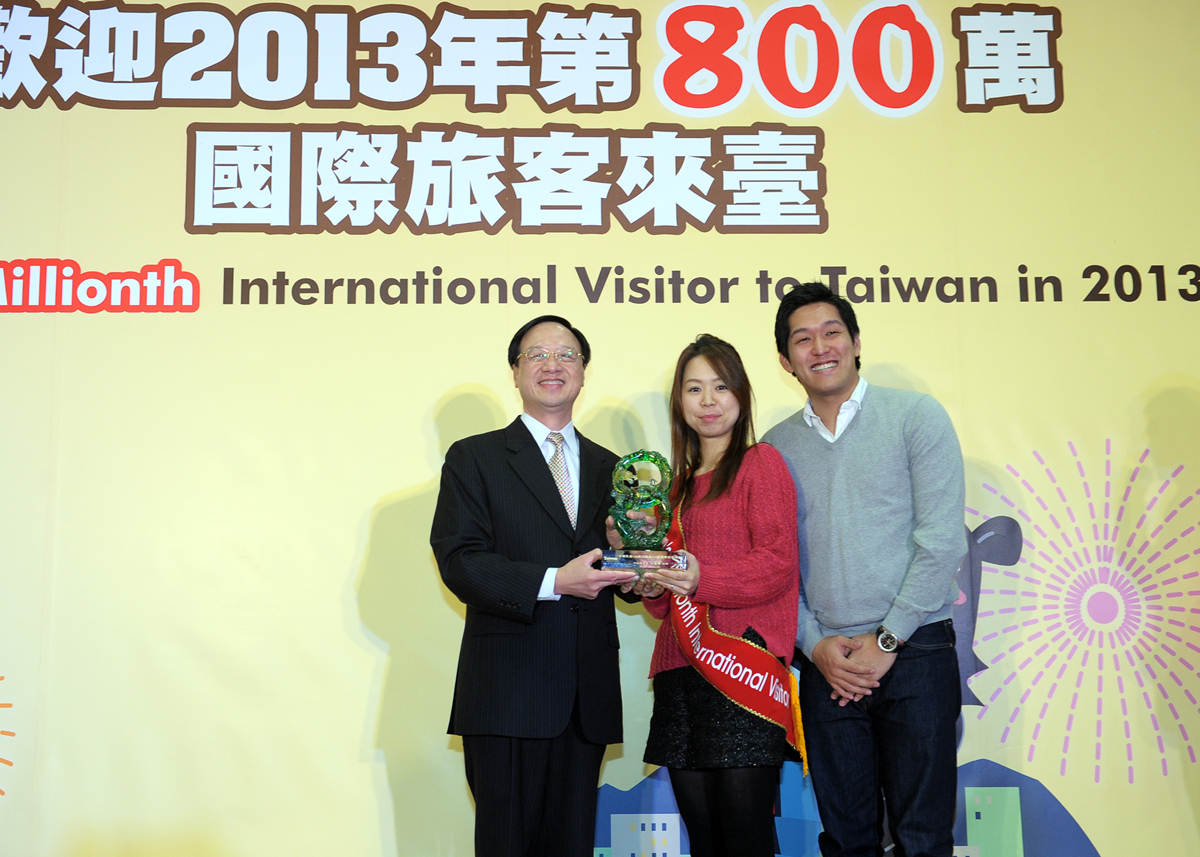 去(102)年12月31日下午,來自日本的表彩女士搭機抵達桃園國際機場,成為去年第800萬名來臺旅客,締造臺灣觀光歷史新高紀錄。
