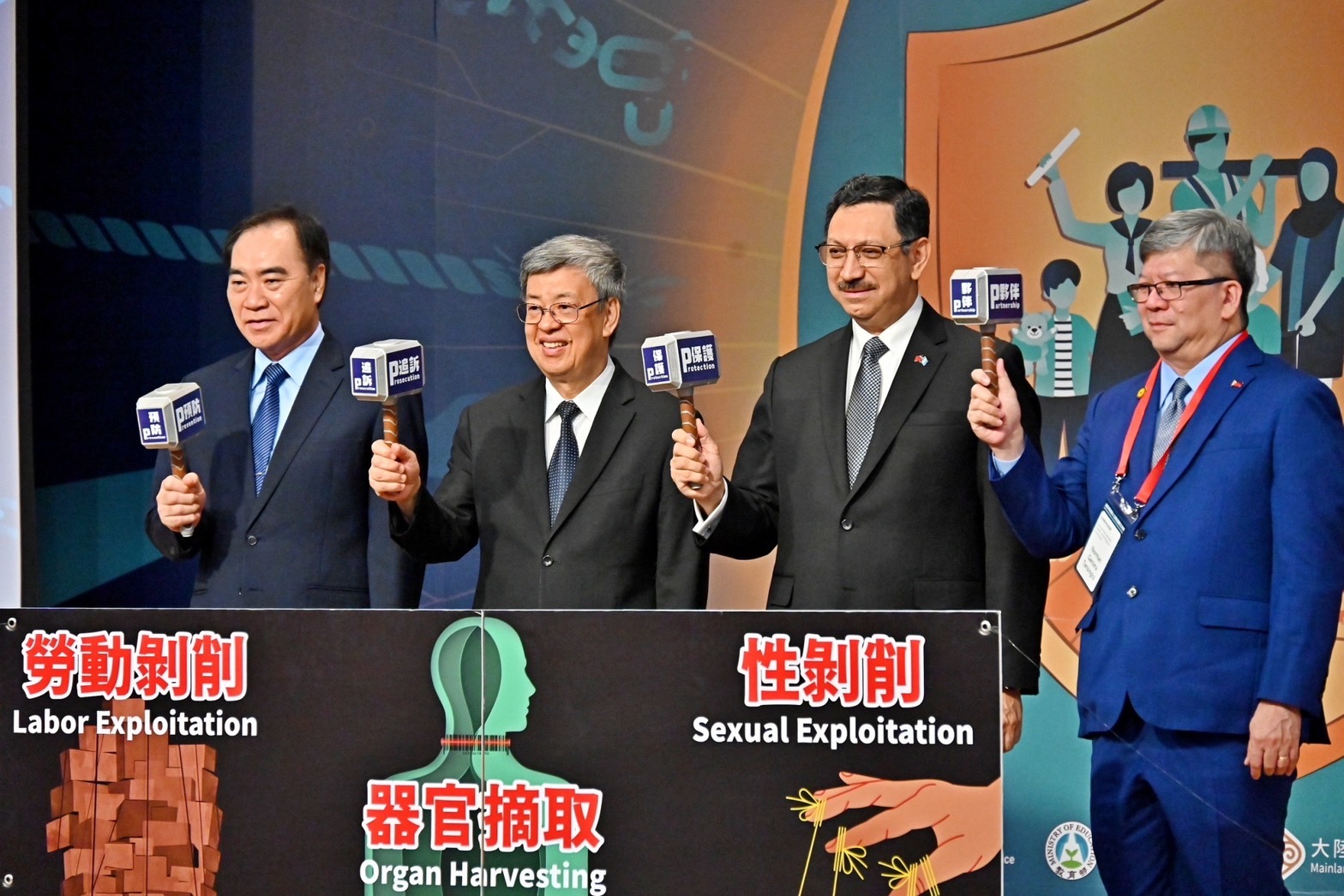 陳院長到場後,先於座位上與現場與會貴賓進行大合影;致詞結束後,院長與內政部次長吳容輝、瓜地馬拉共和國駐臺大使巴迪亞(Oscar Adolfo Padilla Lam)、菲律賓移民局局長唐辛可等人,手持「追訴(Prosecution)」、「保護(Protection)」、「預防(Prevention)」、「夥伴(Partnership)」的4P打擊槌,敲擊儀式板上的人口販運圖像,旋即出現保護各群體的盾牌圖像,彰顯我國打擊人口販運,保護被害人的決心。