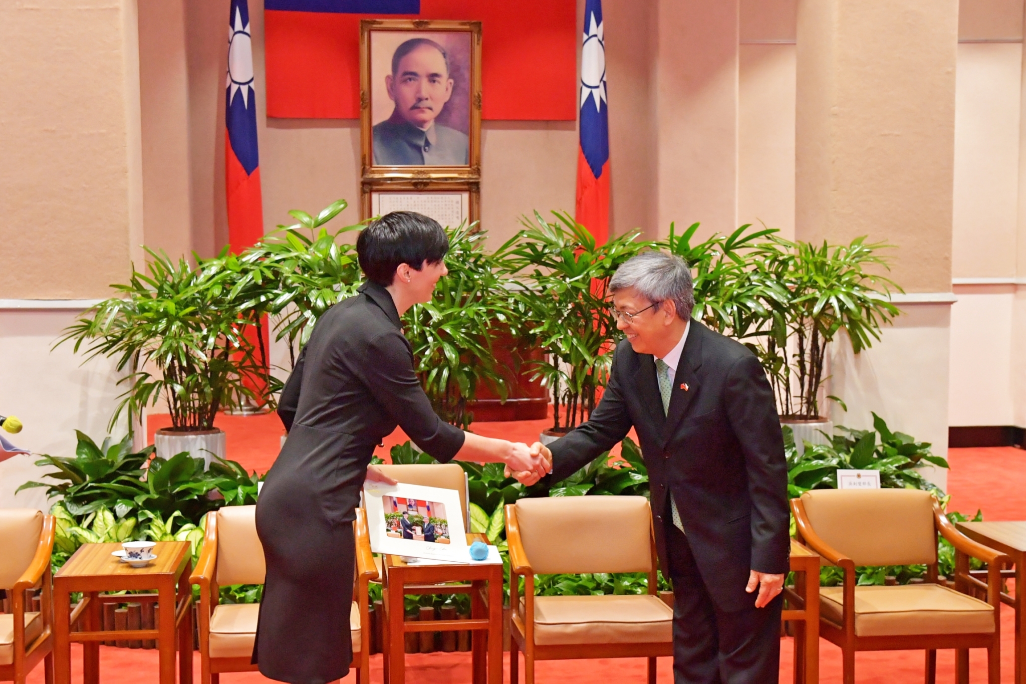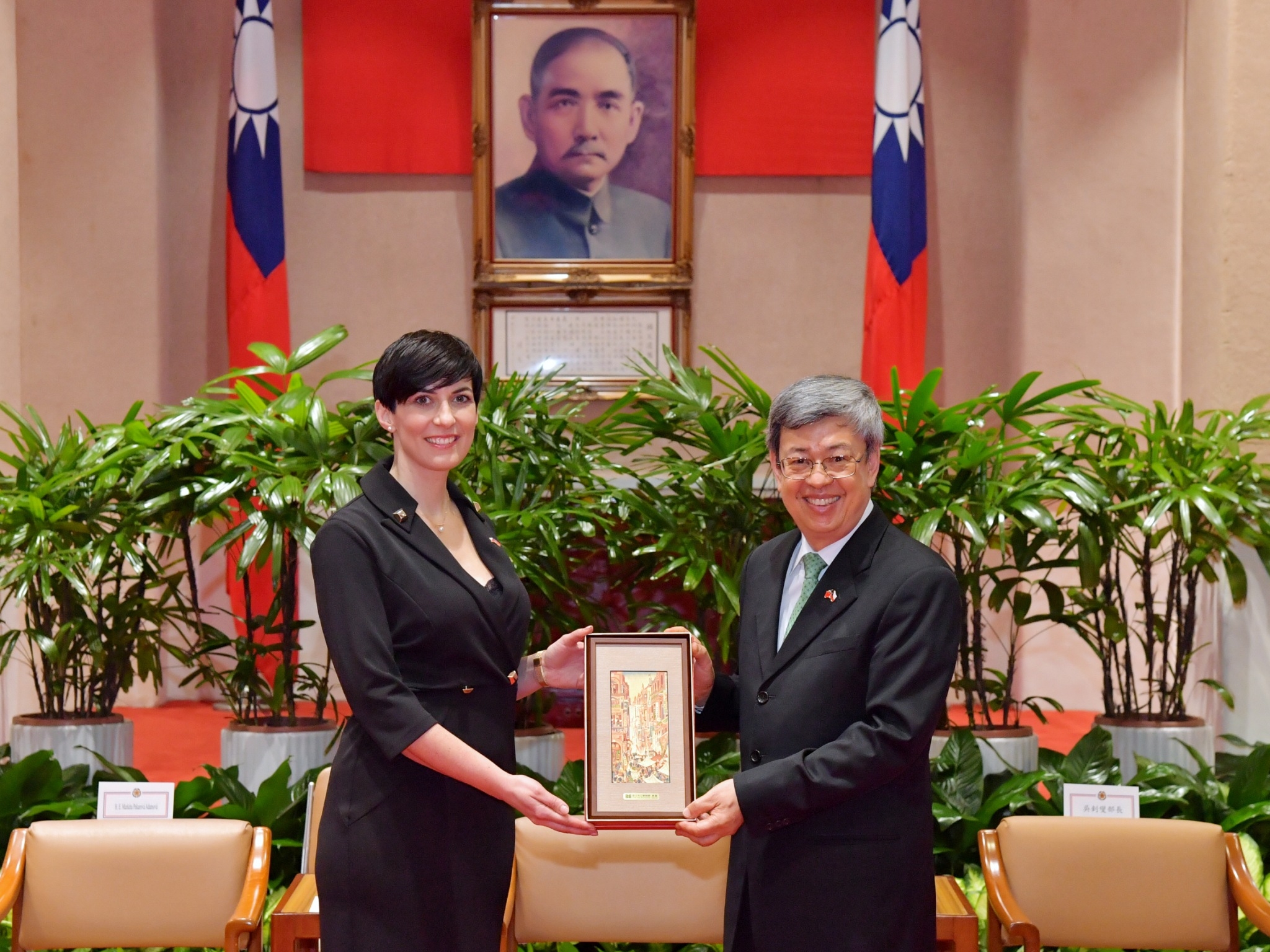 訪賓一行由外交部長吳釗燮及駐捷克代表處代表柯良叡陪同,前來行政院晉見院長,行政院政務委員兼代理發言人羅秉成、行政院政務委員兼國家發展委員會主任委員龔明鑫、經濟部次長陳正祺及數位發展部次長李懷仁也在座。陳院長也致贈艾達莫娃眾議長「南街殷賑複製畫」及其他訪賓「層層食器餐具組」,雙方並合影留念。