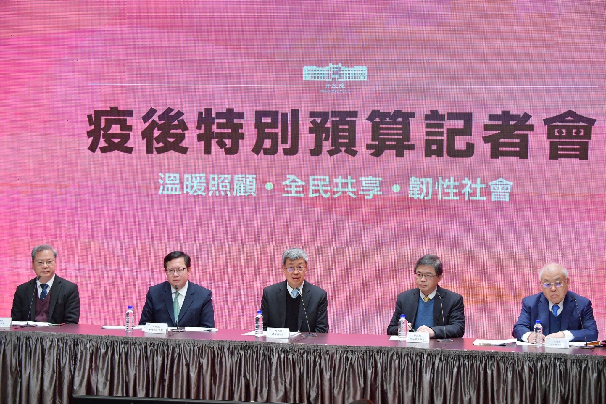 「疫後強化經濟與社會韌性及全民共享經濟成果特別預算案」已於今(23)日在行政院會通過,行政院長陳建仁於院會後偕同鄭文燦副院長、李孟諺秘書長、龔明鑫政委兼國發會主委、朱澤民主計長及各相關部會首長共同召開「疫後特別預算記者會」,向國人報告3,800億疫後特別預算分配情形,並請立法院朝野黨團儘早通過特別預算案審查,讓國人獲得溫暖且及時的照顧,進而打造臺灣成為溫暖而堅韌的國家。
