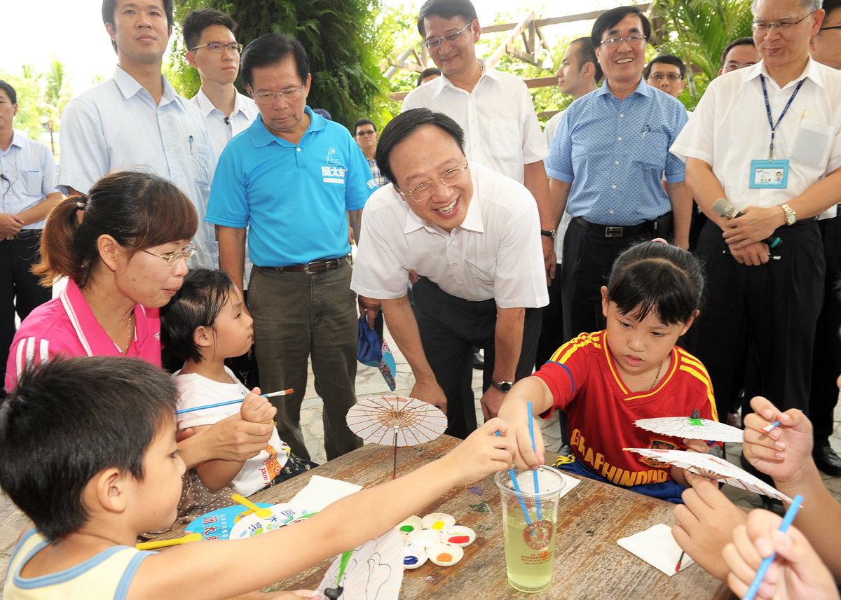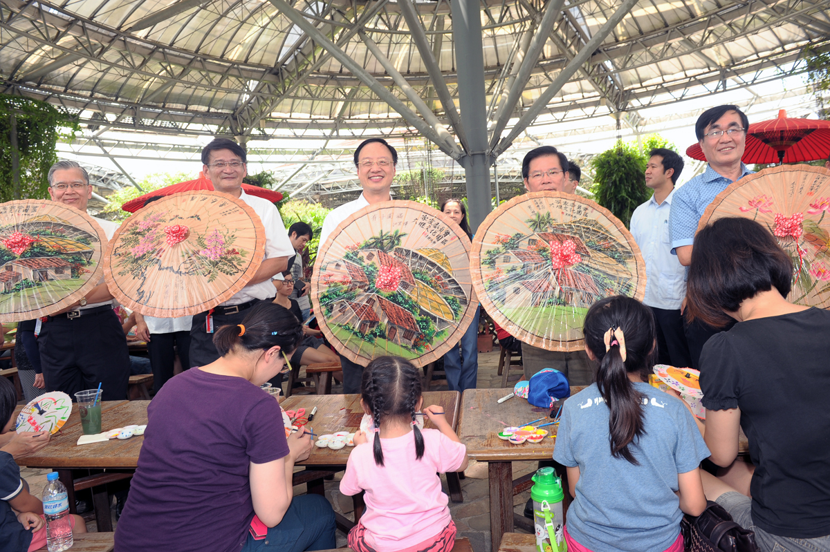 繼去年參訪北部苗栗客家園區後,江院長此次特別安排至南部六堆客家園區視察,除參觀園區外,也觀賞客語生活學校小朋友們的精彩樂舞表演,並共同進行油紙傘DIY ,體驗客家文化的多元風貌。