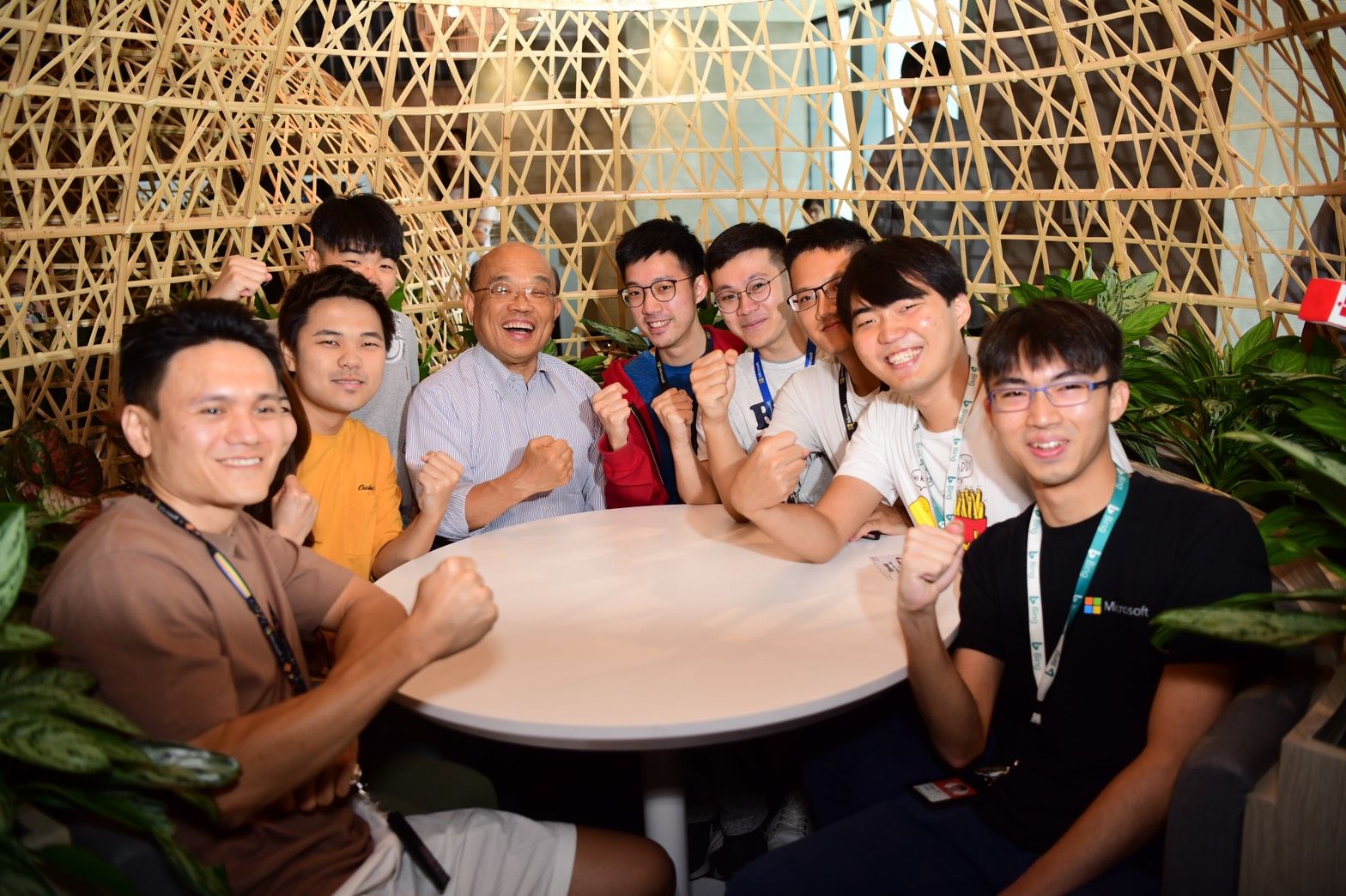 聽完簡報後蘇院長也參觀很有「台味」的微軟員工休息區,看到設計及裝潢概念中滿滿的台灣元素與意象,他甚至脫下西裝外套和微軟員工pk休息區中的投籃機、乒乓球等,氣氛歡樂。院長對於年輕工程師的合照要求也來者不拒,在竹簍酒瓶造型的休息空間中開心拍起「網美照」,不只一起喊「衝衝衝」,也一起比出大愛心合影,讓現場笑聲不斷。他也期許這些年輕有為的工程師們,未來繼續為台灣科技產業發展打拚,在領域中發光發熱。隨後蘇院長也拜訪微軟AI研發中心首席研發總監清大賴尚宏教授與團隊,了解臉部辨識相關的研究發展與科技,並與團隊成員合影,鼓勵年輕的團隊成員們繼續加油!