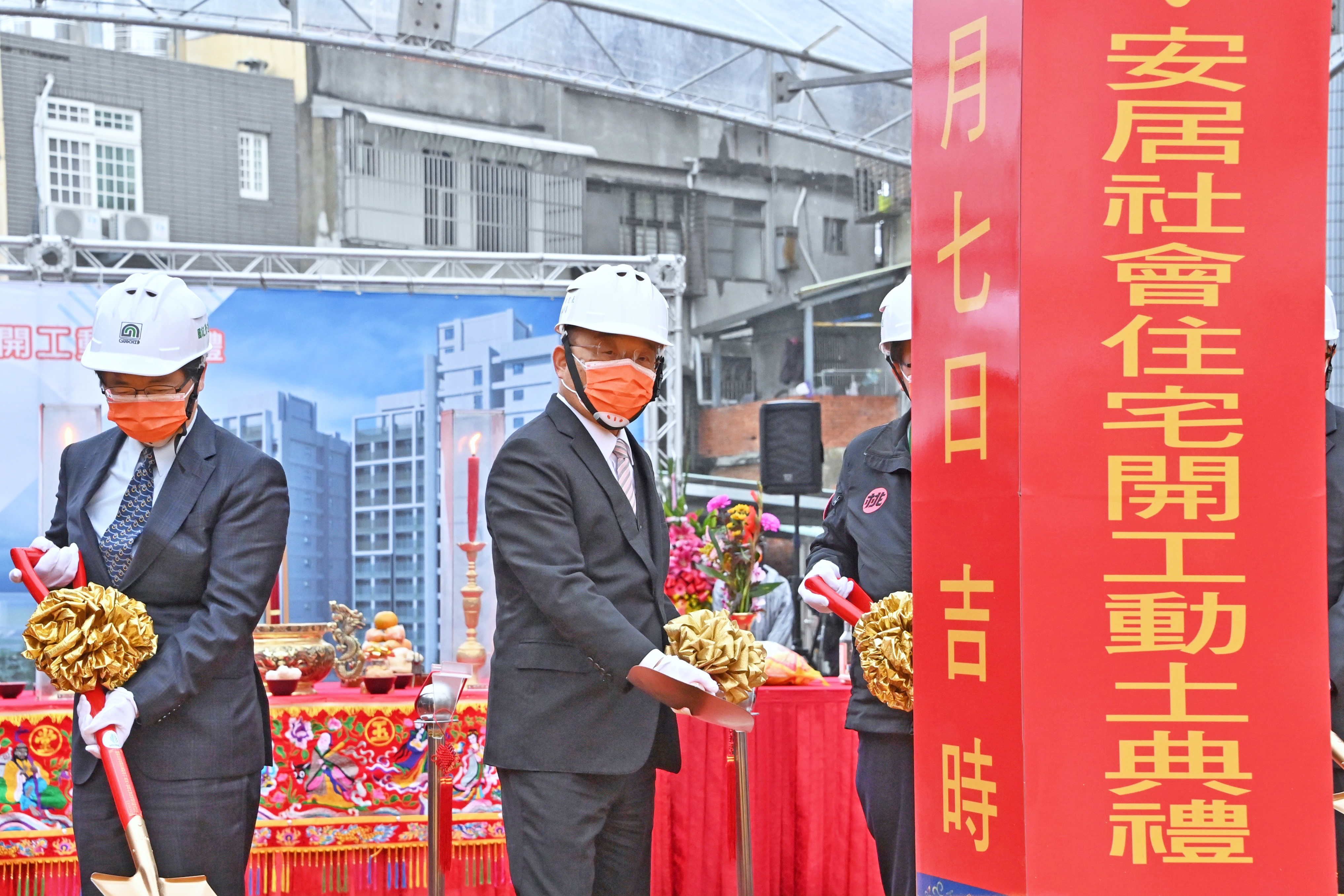 今日開工典禮在祥獅獻瑞及鑼鼓陣聲中熱鬧開場,蘇院長蒞臨會場後,首先聽取國家住都中心代理董事長花敬群簡報桃園市社會住宅興建藍圖,隨後於開工祝禱時,虔誠獻香、獻花、獻菓、獻酒、獻餚及獻財帛,祈求工程順利,並提起金鏟,起鍬三鏟,完成動土儀式,同時院長也在金鏟上簽名,並與貴賓一同合影留念。