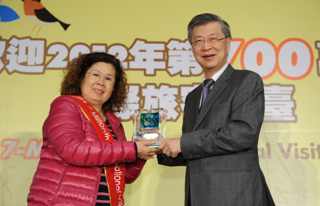 陳院長致詞時,除歡迎來自馬來西亞的第700萬旅客-林瑞珍女士及其家人一行外,並表示林女士來臺旅遊的時機(timing)很好,使觀光局推出的口號「Time for Taiwan」更具意義。