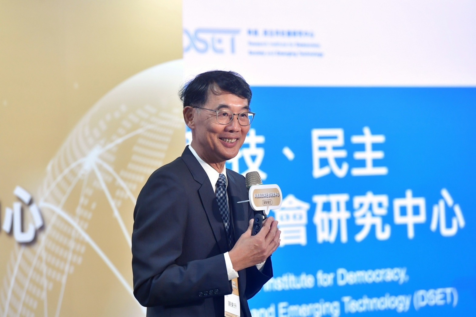 此行,陳院長抵達後,手持「前瞻科技 永續社會」手板與現場貴賓在座位上合影,隨後一同欣賞「科技、民主與社會研究中心」理念核心意象影片,並聽取DSET陳東升召集人簡報該中心目標及任務。致詞結束後,院長也與行政院政務委員兼國家科學及技術委員會吳政忠主委、行政院林子倫發言人、環境部施文真次長、國立政治大學李蔡彥校長及產官學界等貴賓在臺上手持「科技、民主與社會研究中心」大型手板進行大合影,共同完成啟動儀式。