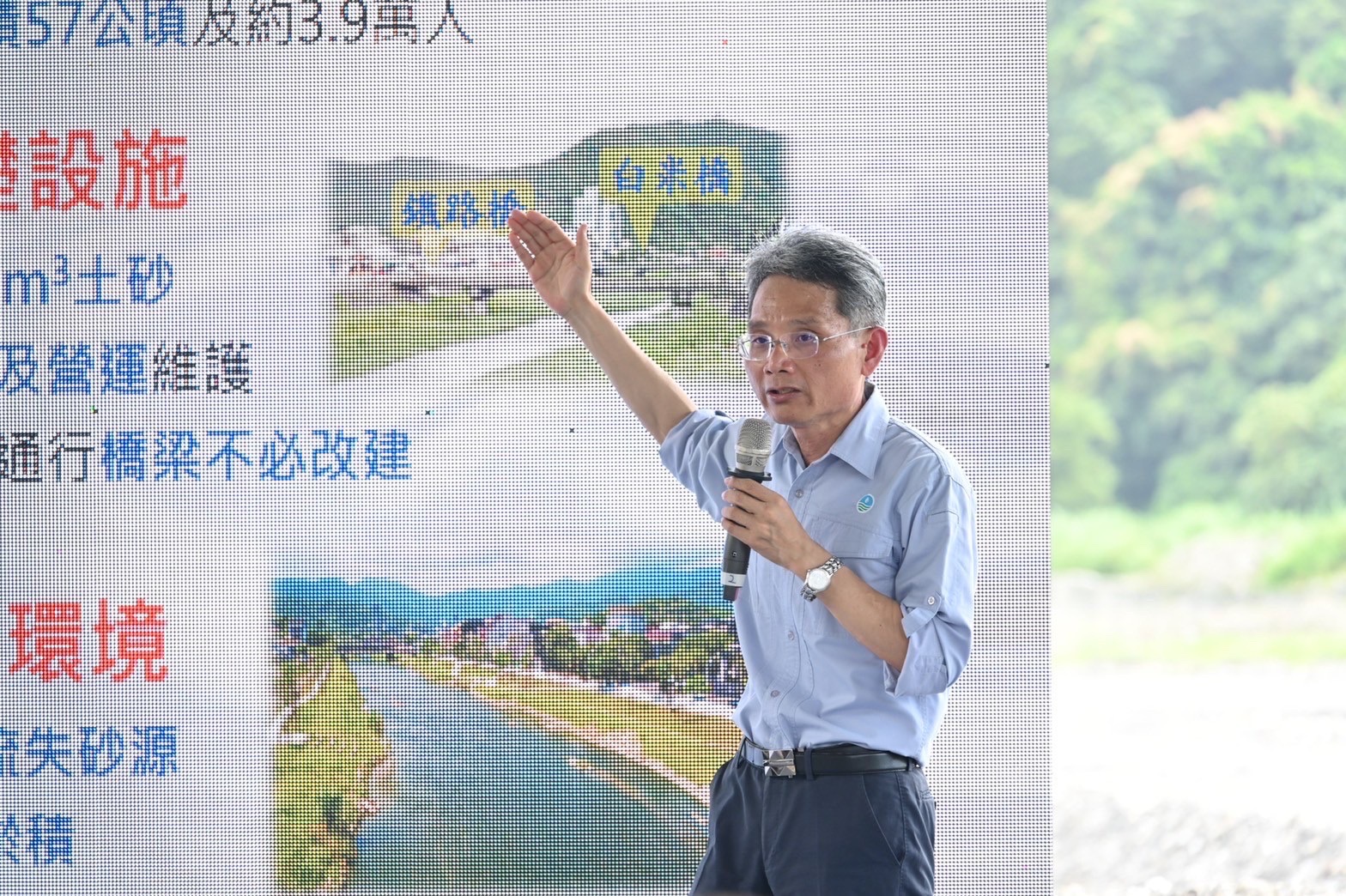 陳院長到場後首先聆聽賴建信署長簡報「蘇澳溪分洪工程」,說明宜蘭各項水環境建設、蘇澳溪分洪工程規劃與預期效益,以及整體治水成效等內容。致詞結束後,院長前往蘇澳溪畔進行現地視察,聽取賴署長說明分洪工程實地位置與模擬運作情形,並為水利署同仁加油打氣,肯定及感謝他們在水環境建設上所付出的努力與辛勞。