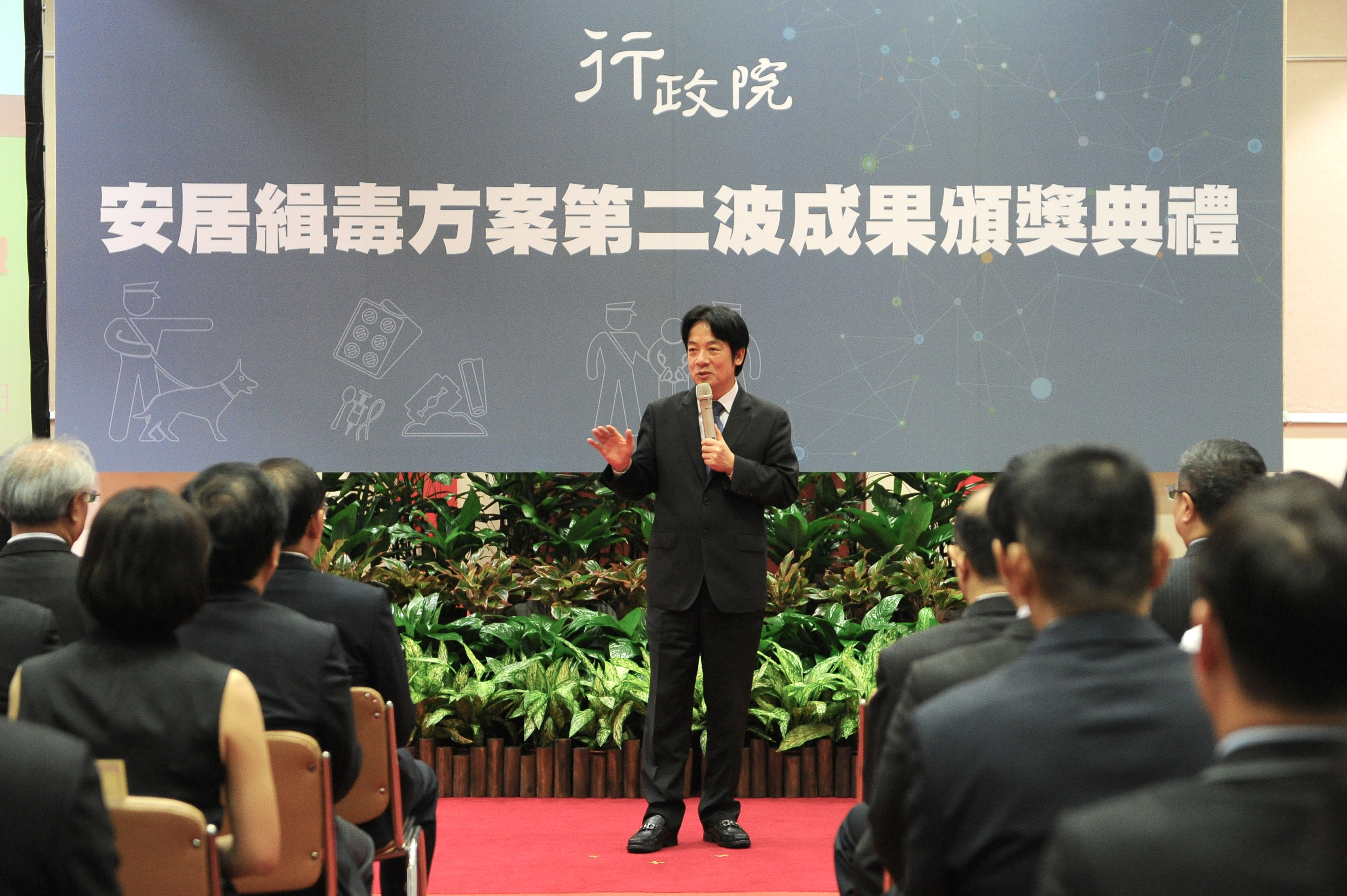 行政院長賴清德今(26)日出席「安居緝毒方案第二波成果頒獎典禮」時表示,第一波安居緝毒方案所查緝毒品達4千多公斤,第二波是5,731公斤,合計逮捕1,913名藥頭,頗具成果。但政府對於吸毒、製毒、販毒及運毒查緝仍有努力空間,未來4年會提供100億經費投入人力物力資源,使緝毒人員更有能力查緝毒品。