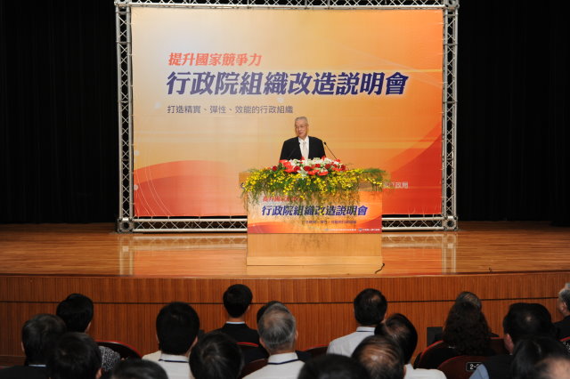 行政院長吳敦義今(23)日出席行政院組織改造說明會時表示,行政院的組織改造工作是廿多年來各方關注的議題,雖然組改工程浩大,但如何使組改過程更順暢,以達成精實人力、彈性務實並發揮效能的目標,則是組改最重要的宗旨。他期許各部會首長能克服困難,與行政同仁多溝通協調,讓組改能順利推動。