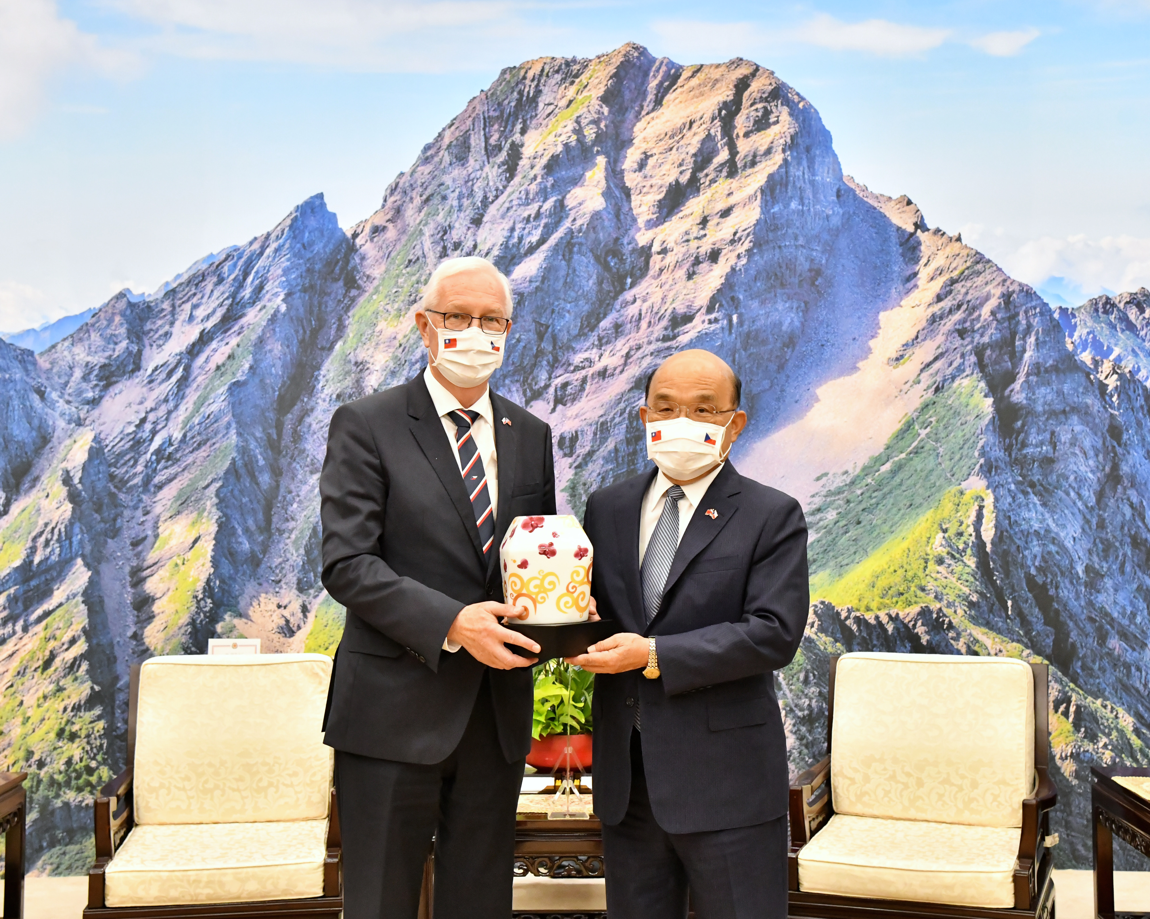 此行訪團成員另包括:捷克教育部次長維多娃(Radka Wildová)、科技部次長哈利科娃(Jana Havlikova)、國家博物館館長盧卡其(Michal Lukeš)、厄斯特拉夫大學醫學院院長馬札爾(Rastislav Maďar)、國家博物館副館長斯特利(Michal Stehlík)、科學院ELI Beamlines雷射中心主任哈維塔(Roman Hvězda)、厄斯特拉夫大學附設醫院麻醉急重症科主任謝夫契(Pavel Ševčík)、國家公共衛生研究院傳染病防疫所主任金克爾(Jan Kynčl)、馬薩里克大學資安中心主任皮特納(Tomáš Pitner)、理工大學資安中心主任布爾克(Jaroslav Burčík)、科學院電腦科學所研究員內魯達(Roman Neruda)、德拉霍斯主席辦公室主任梅斯齊(Martin Mejstřík),行政院政務委員黃致達、行政院政務委員兼國家科學及技術委員會主委吳政忠、外交部長吳釗燮、教育部長潘文忠、文化部長李永得、衛生福利部長薛瑞元、數位發展部長唐鳳、駐捷克代表處代表柯良叡,以及捷克經濟文化辦事處代表史坦格(David Steinke)陪同。此次蘇院長致贈德拉霍斯主席祈福天燈檯燈,以及其他訪賓琳琅茶香・茶壺茶具禮盒,雙方並合影留念。