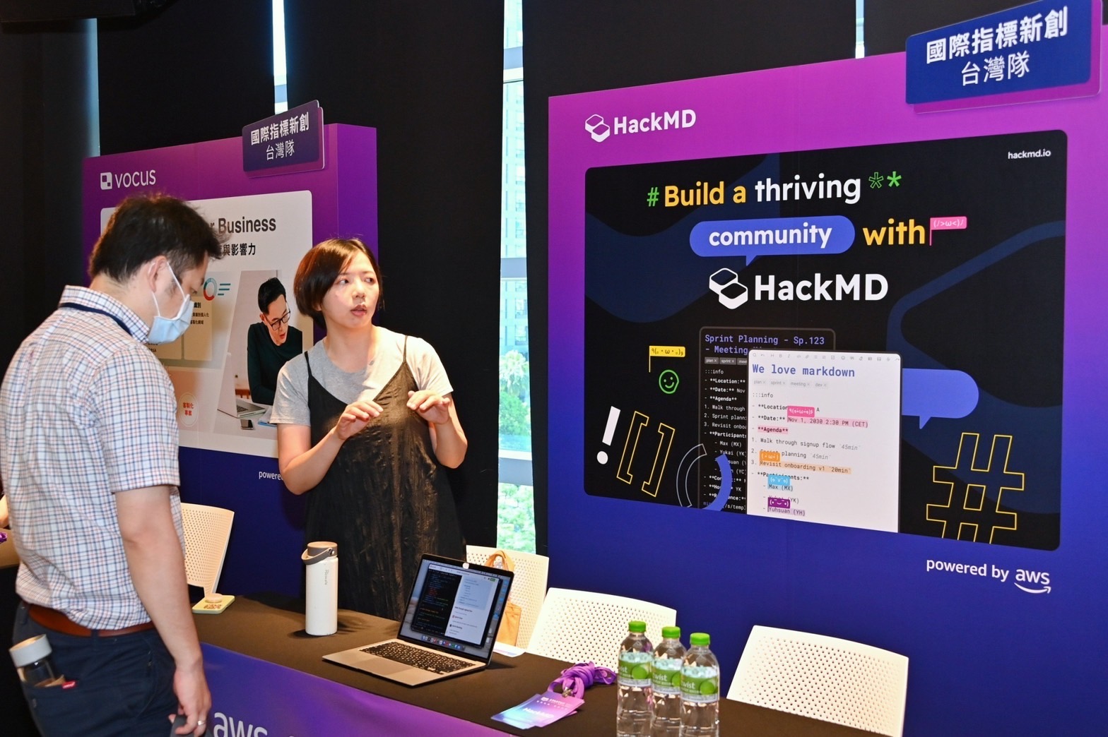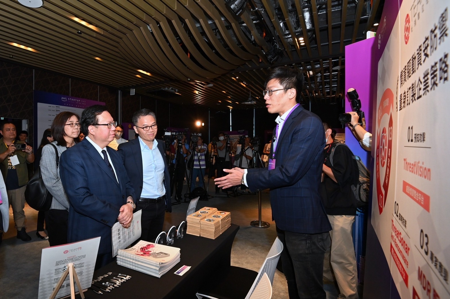 鄭副院長抵達會場後,首先參觀國際指標新創臺灣隊的杜浦數位安全股份有限公司(TEAM T5)以及友榆股份有限公司(Tomofun)AI寵物科技等兩個參展新創公司攤位,並致詞後與AWS台灣暨香港總經理王定愷以及數位發展部數位產業署胡貝蒂副署長等貴賓一起合影留念,為論壇揭開序幕。