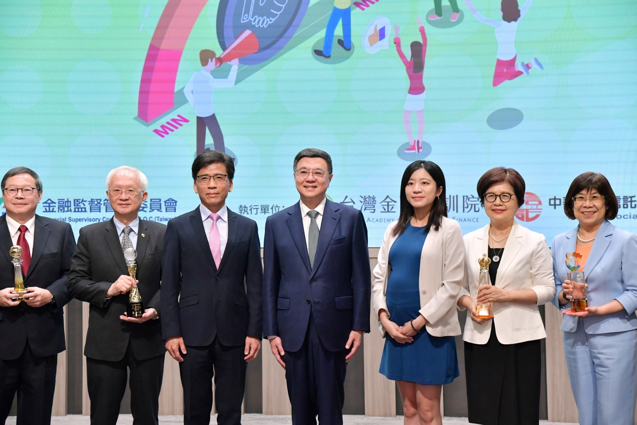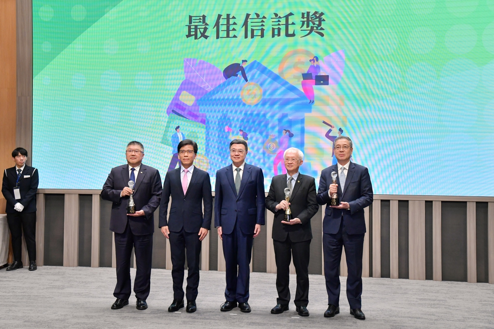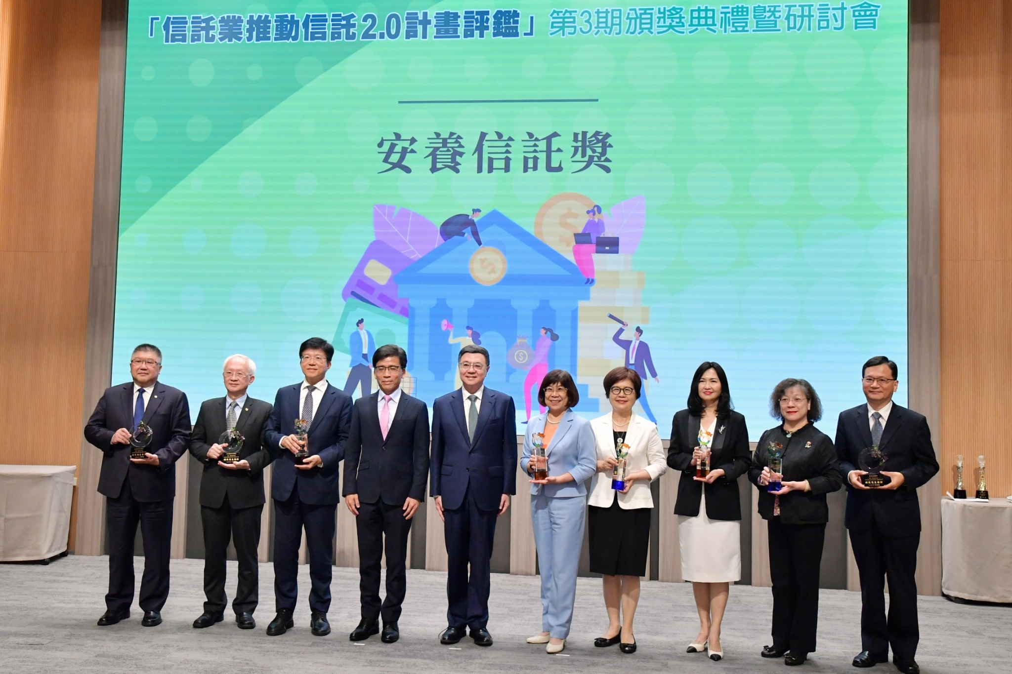 致詞結束後,卓院長頒發「最佳信託獎」、「安養信託獎」、「員工福利信託獎」、「信託業務創新獎」及「信託結盟獎」等獎項予所有得獎者,並與金管會彭金隆主委、行政院謝子涵副發言人一同合影留念。