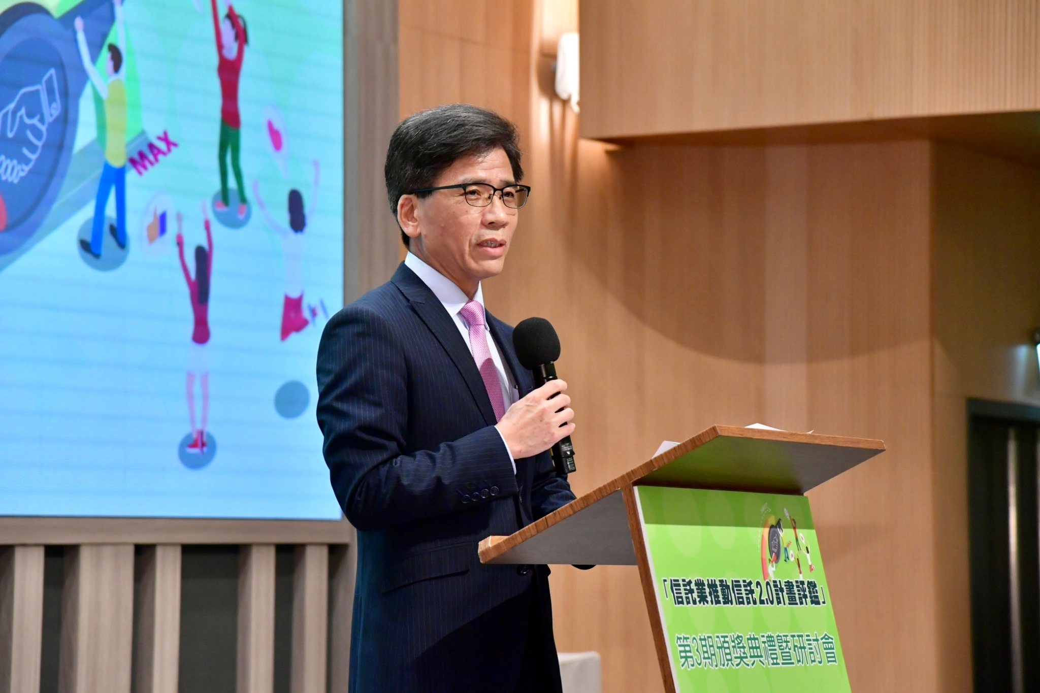 卓院長特別感謝今日在場所有受獎單位,而本期頒獎典禮,更新設「信託結盟獎」,透過鼓勵信託業與社福團體、安養機構、資訊科技業及醫療產業等跨業合作,提供全新服務,成為新的產業鏈,期盼大家持續精進相關業務,使「信託2.0計畫」延伸更多元的觸角,讓參與信託服務的民眾感到更安心與溫暖。