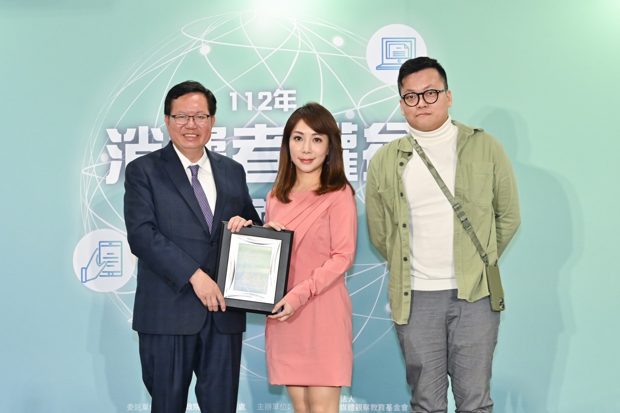 致詞結束後,鄭副院長逐一頒發「電視及網路(影音)類-即時報導獎」的特優、優勝及佳作獎項予東森電視事業股份有限公司、三立電視股份有限公司、三立新聞臺與八大電視共10位媒體工作者,肯定其對於提升民眾消費權益認知的努力,並合影留念。