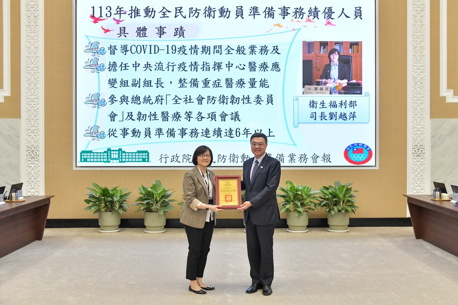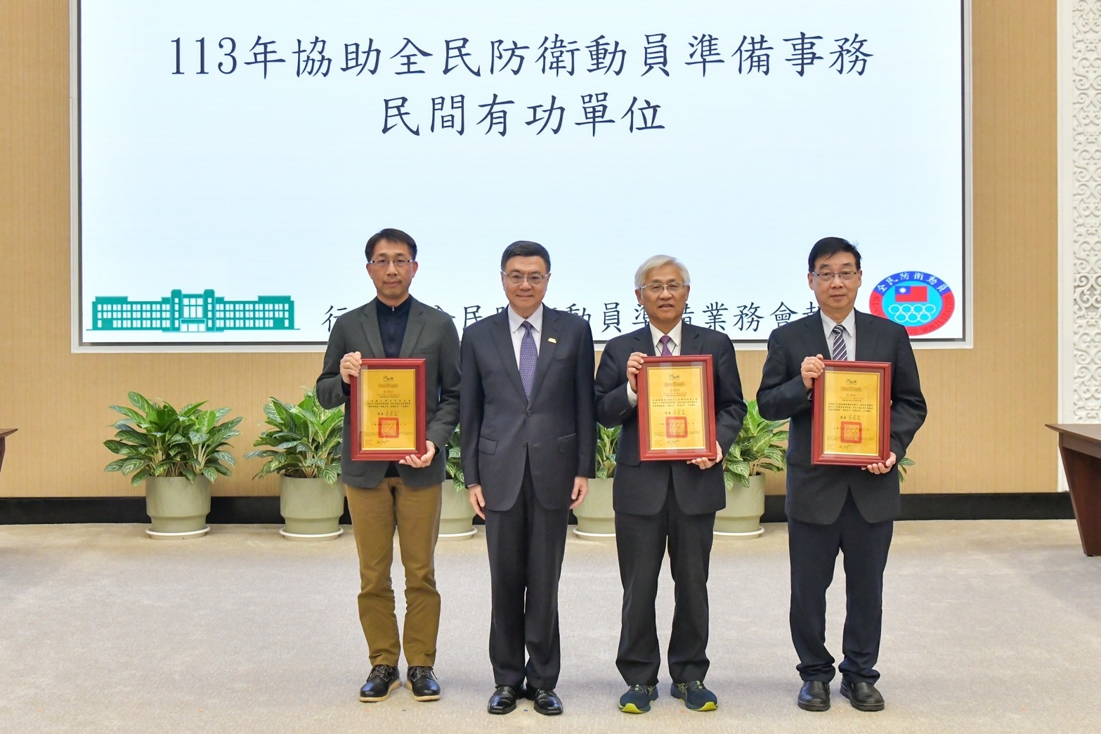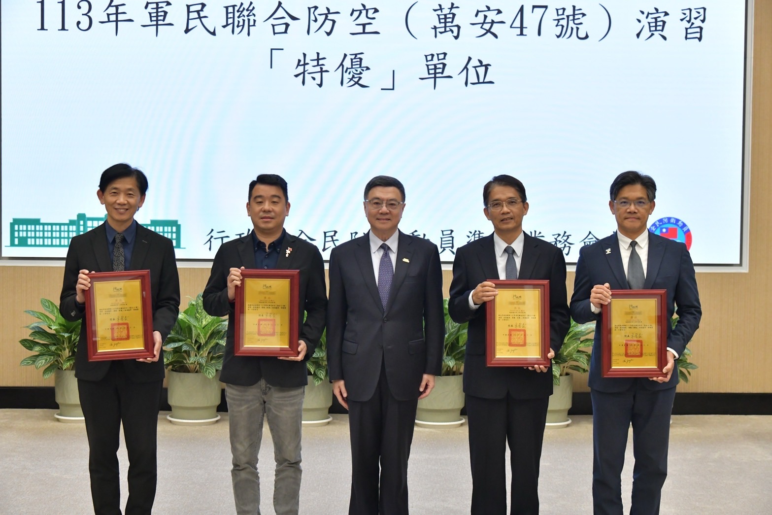 卓院長於會前首先觀賞動員紀實影片,並頒獎表揚113年度全民防衛動員暨災害防救(民安10號)演習兵棋推演及綜合實作「特優」單位、軍民聯合防空(萬安47號)演習「特優」單位、直轄市、縣(市)政府動員業務訪評「特優」單位、協助全民防衛動員準備事務有功單位,以及推動全民防衛動員準備事務績優人員等,並與受獎代表合影留念。