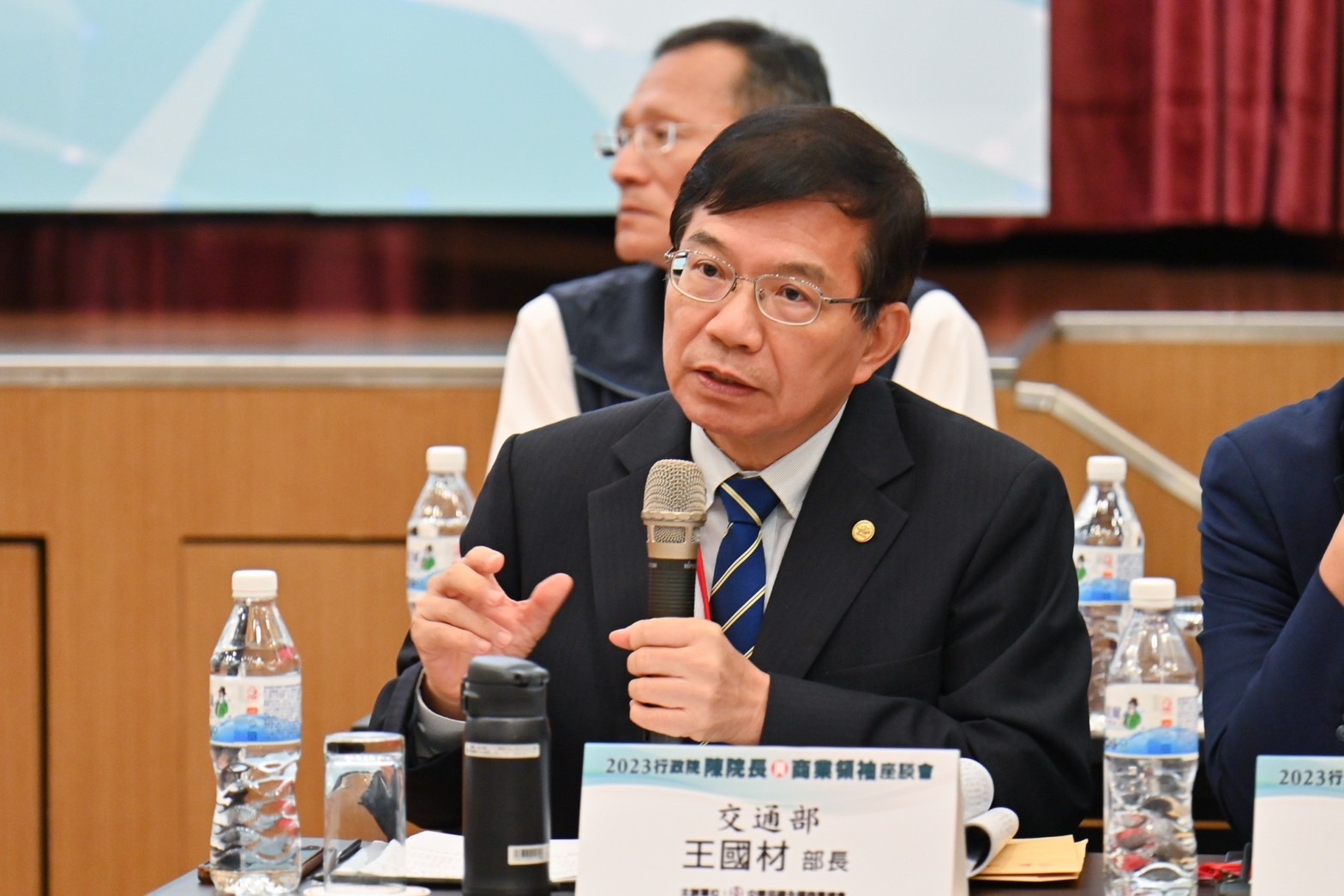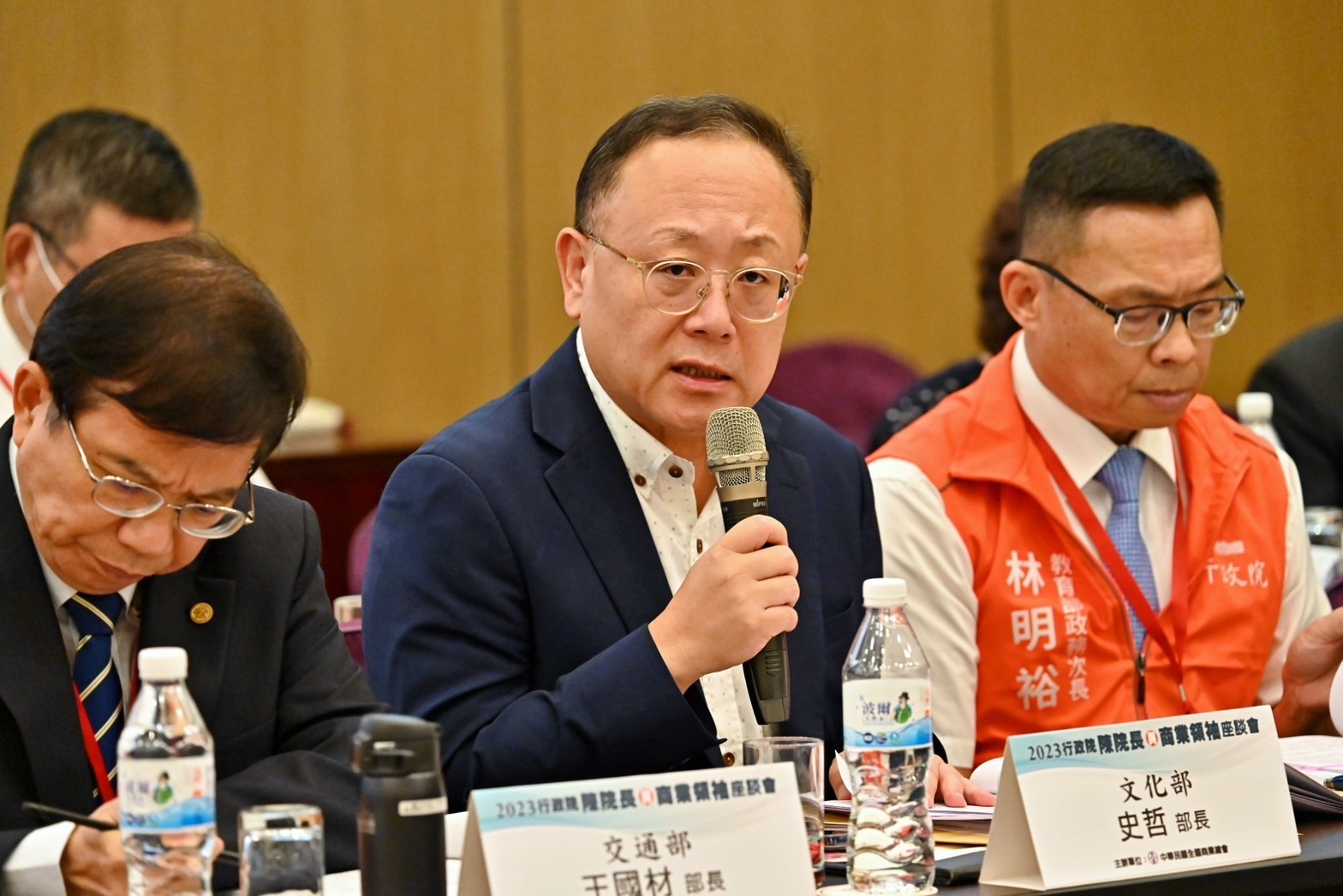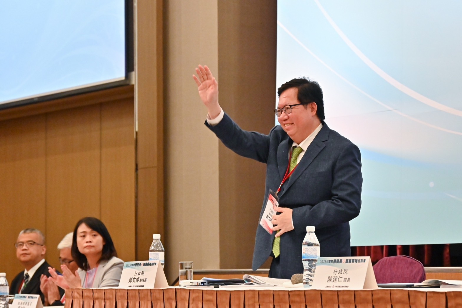 今日座談會由陳院長率行政院鄭文燦副院長、林子倫發言人、經濟部王美花部長、交通部王國材部長、文化部史哲部長、金融監督管理委員會黃天牧主任委員、內政部吳堂安次長、財政部李慶華次長、教育部林明裕次長、勞動部陳明仁次長、衛生福利部王必勝次長、行政院農業委員會杜文珍副主任委員、行政院環境保護署沈志修副署長、國家發展委員會施克和副主任委員、財政部賦稅署宋秀玲署長、經濟部工業局連錦漳局長、經濟部國際貿易局江文若局長、交通部公路總局陳文瑞局長等人與會。