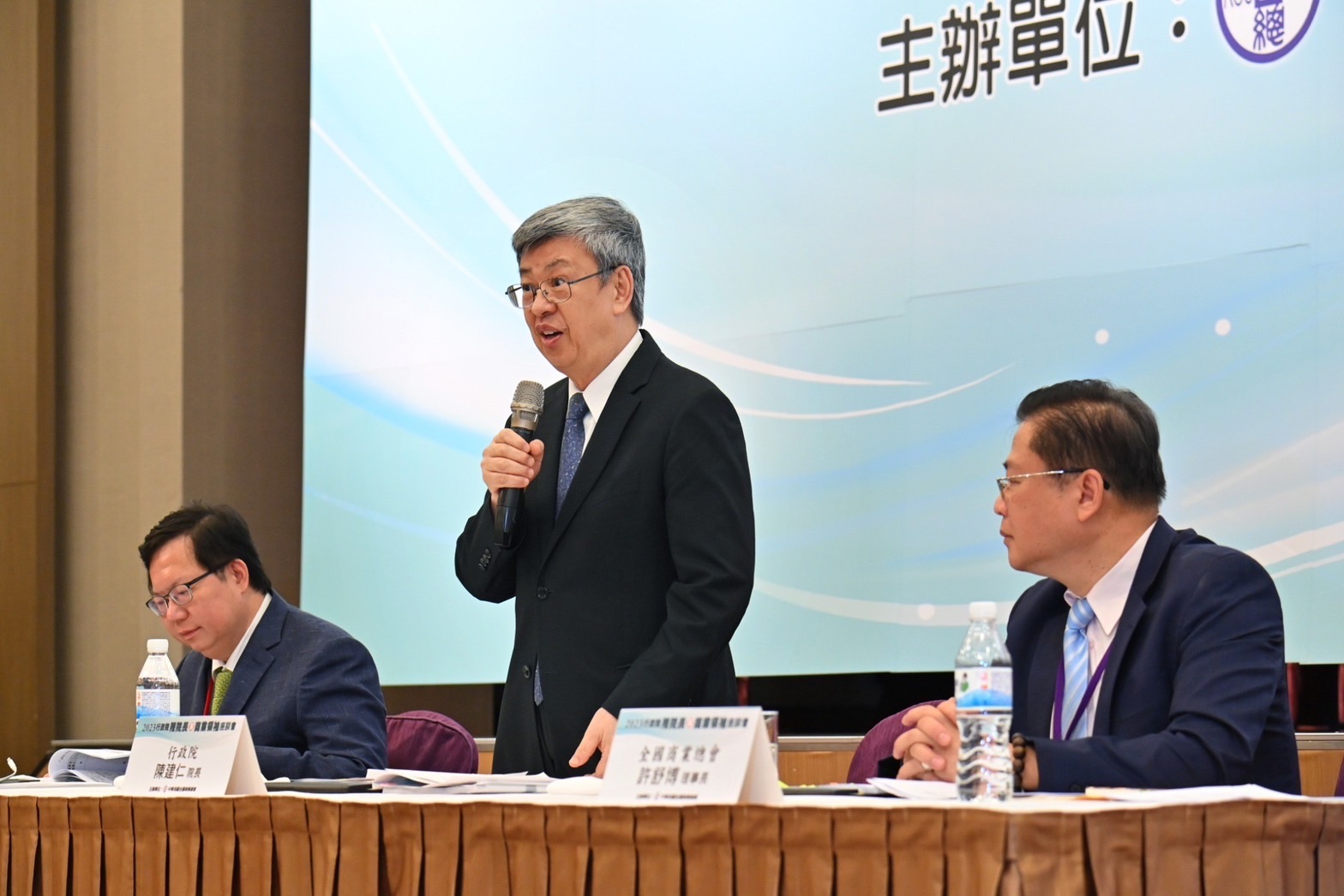 陳院長表示,今日很高興有機會與各商業領袖代表齊聚一堂,尤其在場的商業領袖代表對於臺灣經濟發展皆扮演舉足輕重的關鍵角色,他要感謝大家的付出,政府也會與企業界一同努力,攜手打造美麗幸福的臺灣,讓臺灣人民擁有溫暖堅韌的生活。