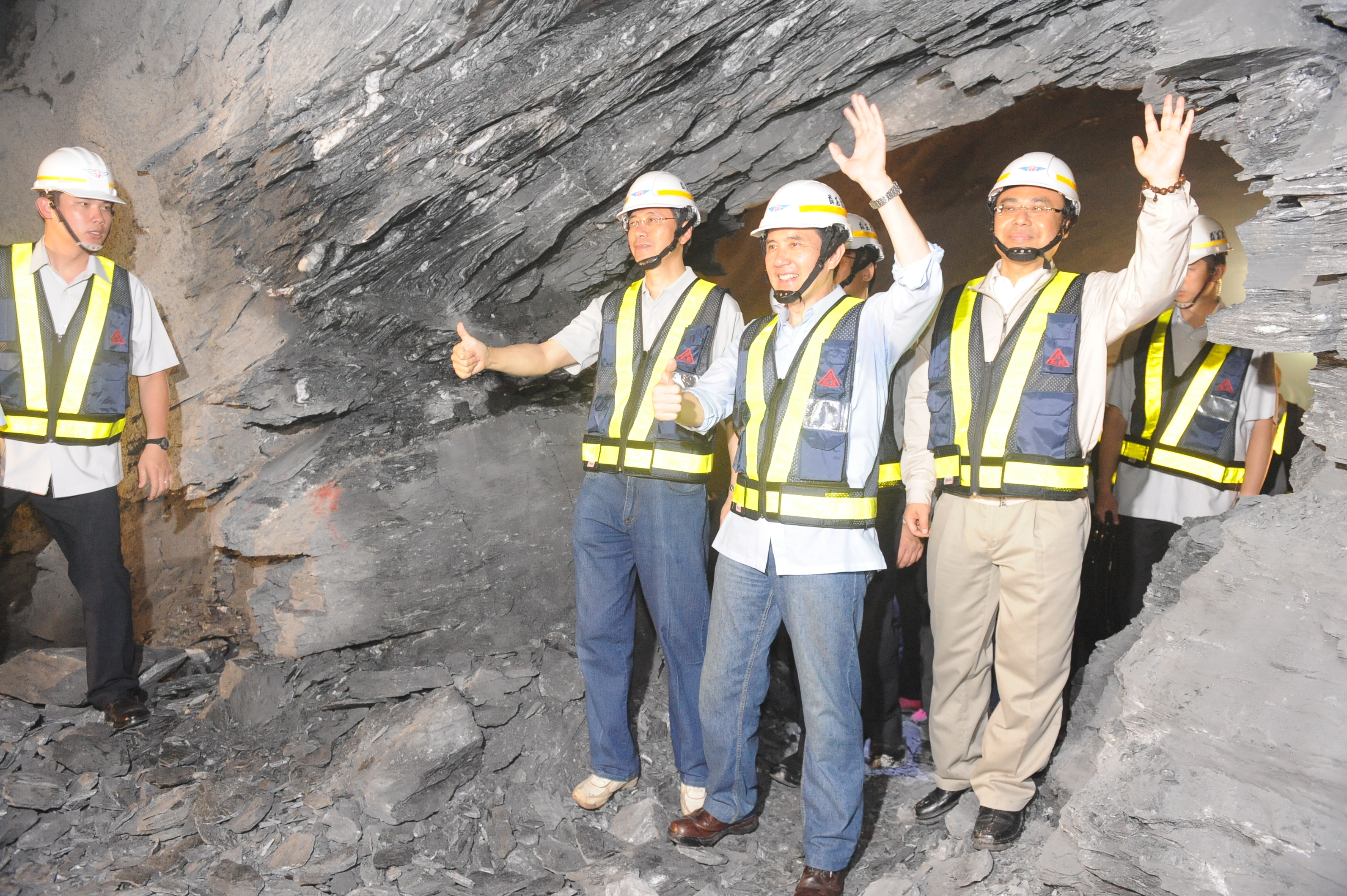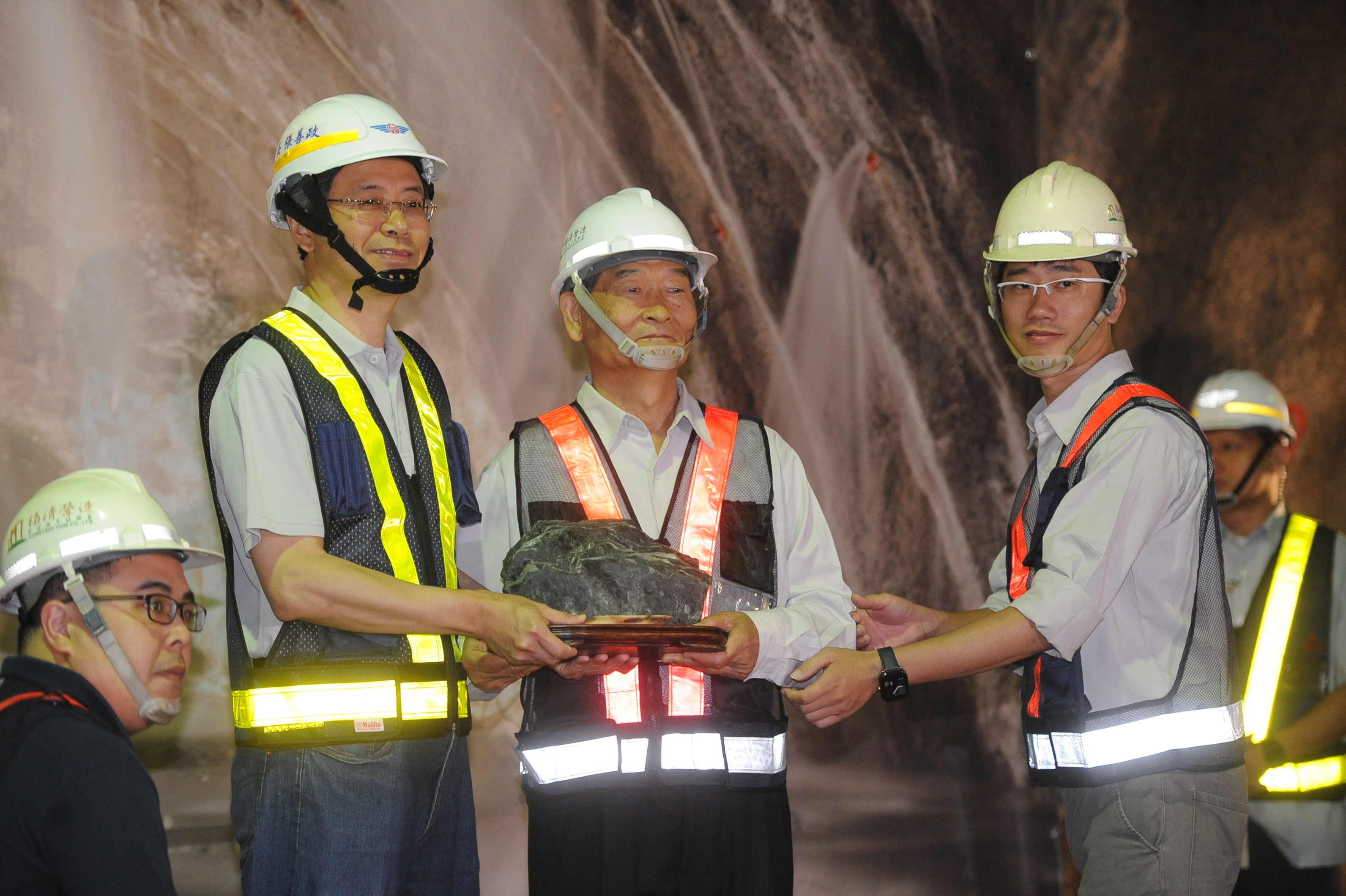 蘇花改觀音隧道全線在馬總統與張院長一同啟動水晶球後,爆破貫通,並由兩人帶領工程團隊及與會嘉賓一起踏過貫通面,撿拾貫通石。