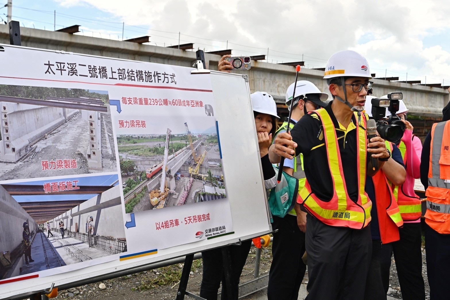 致詞結束後,卓院長偕同行政院李慧芝發言人、交通部陳世凱部長、國家發展委員會彭立沛副主委、交通部鐵道局楊正君局長、行政院東部聯合服務中心洪宗楷執行長、許文獻副執行長、莊瑞雄立委、陳瑩立委、黃建賓立委、臺東縣饒慶鈴縣長、臺灣鐵路公司杜微董事長等人進行現地視察,由鐵道局東部工程分局黃鳳岡分局長說明太平溪二號橋上部結構施作方式,瞭解現場施工狀況。