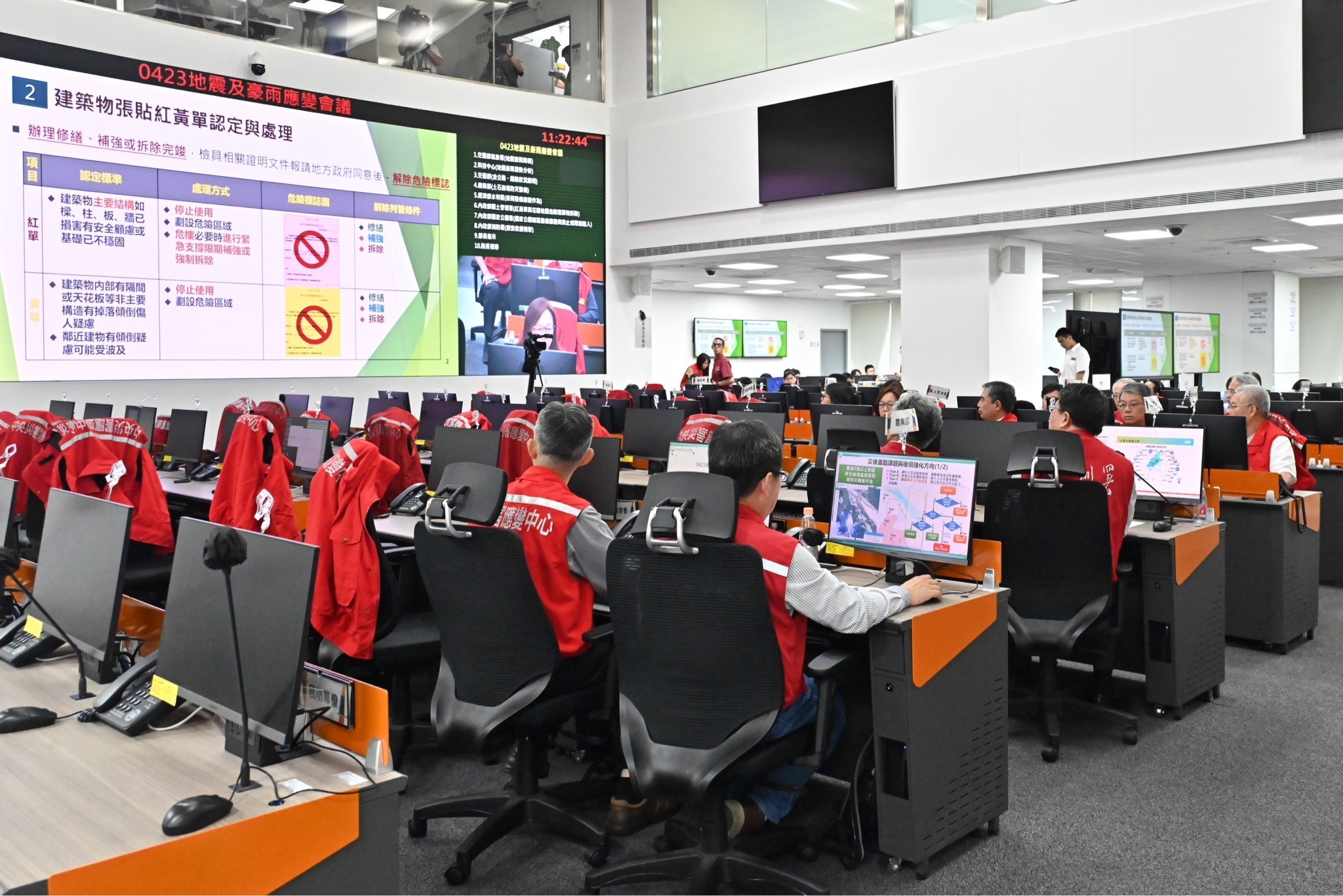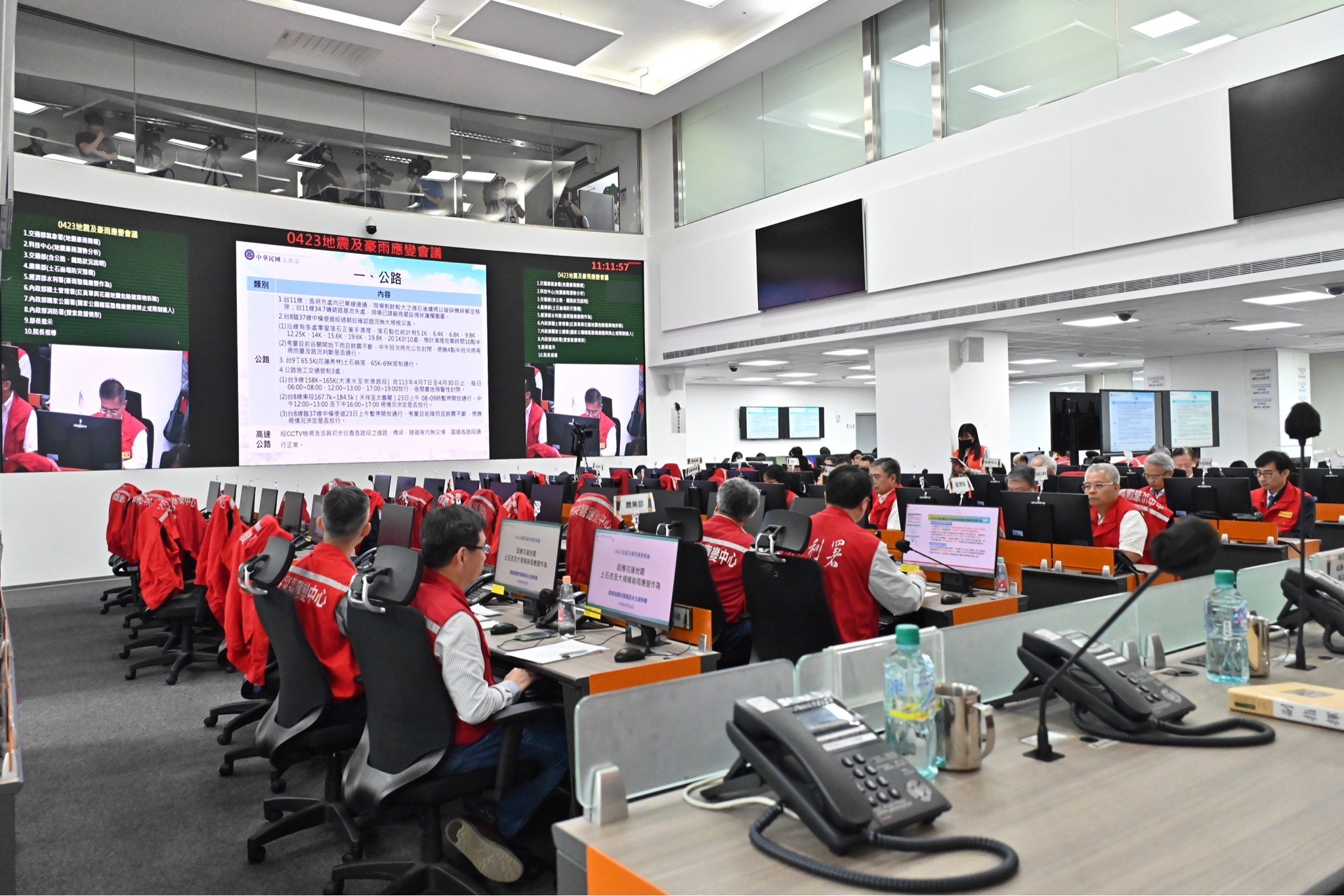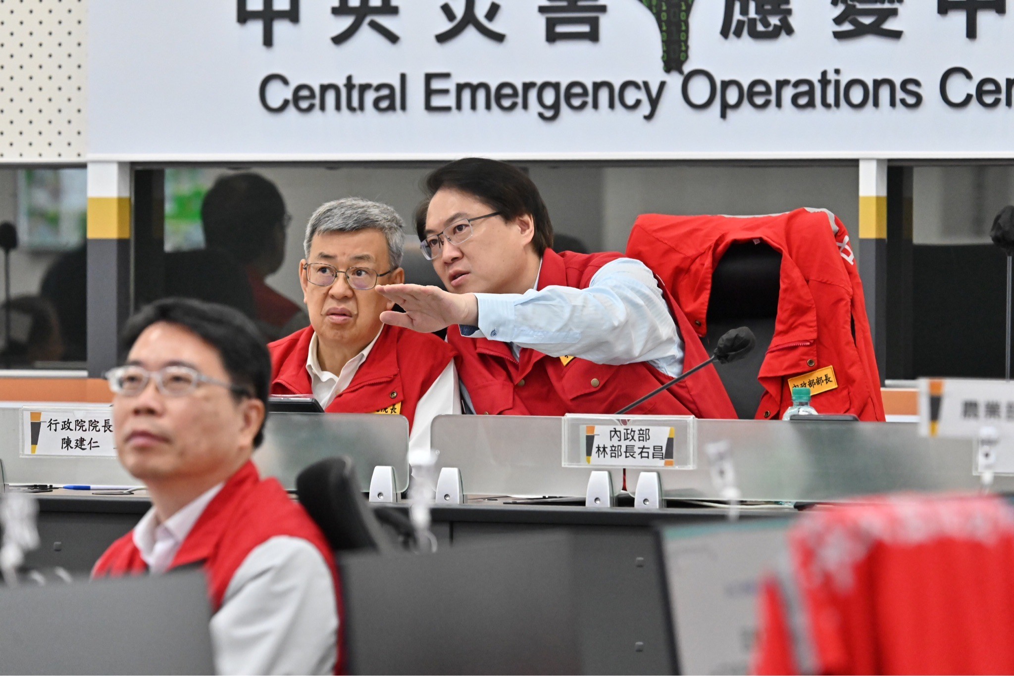 此行,陳院長偕同行政院李孟諺秘書長、林子倫發言人、指揮官內政部林右昌部長、經濟部陳正祺次長等人抵達中央災害應變中心後,依序聽取交通部中央氣象署、國家災害防救科技中心、交通部、農業部、經濟部水利署、內政部國土管理署、國家公園署及消防署等報告,了解各相關部會因應近日地震及豪雨之應變及整備情形。