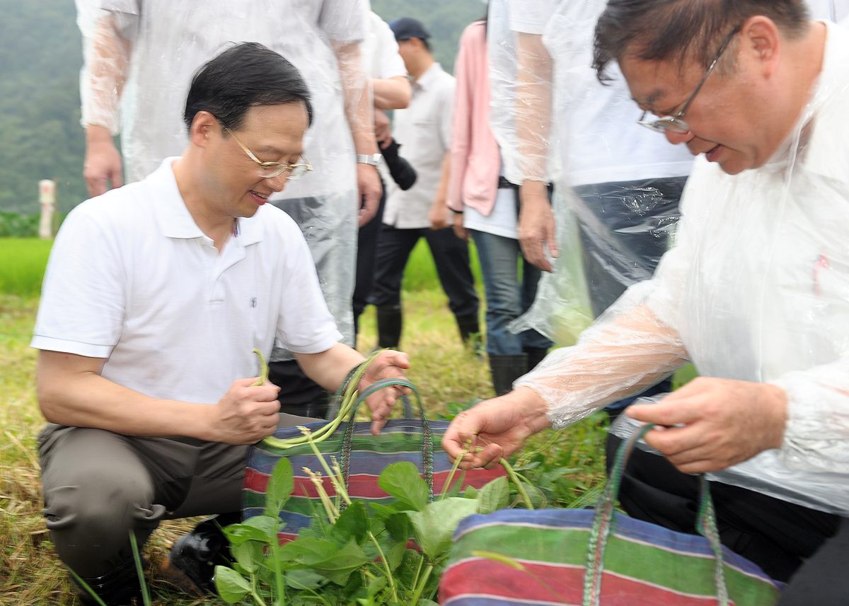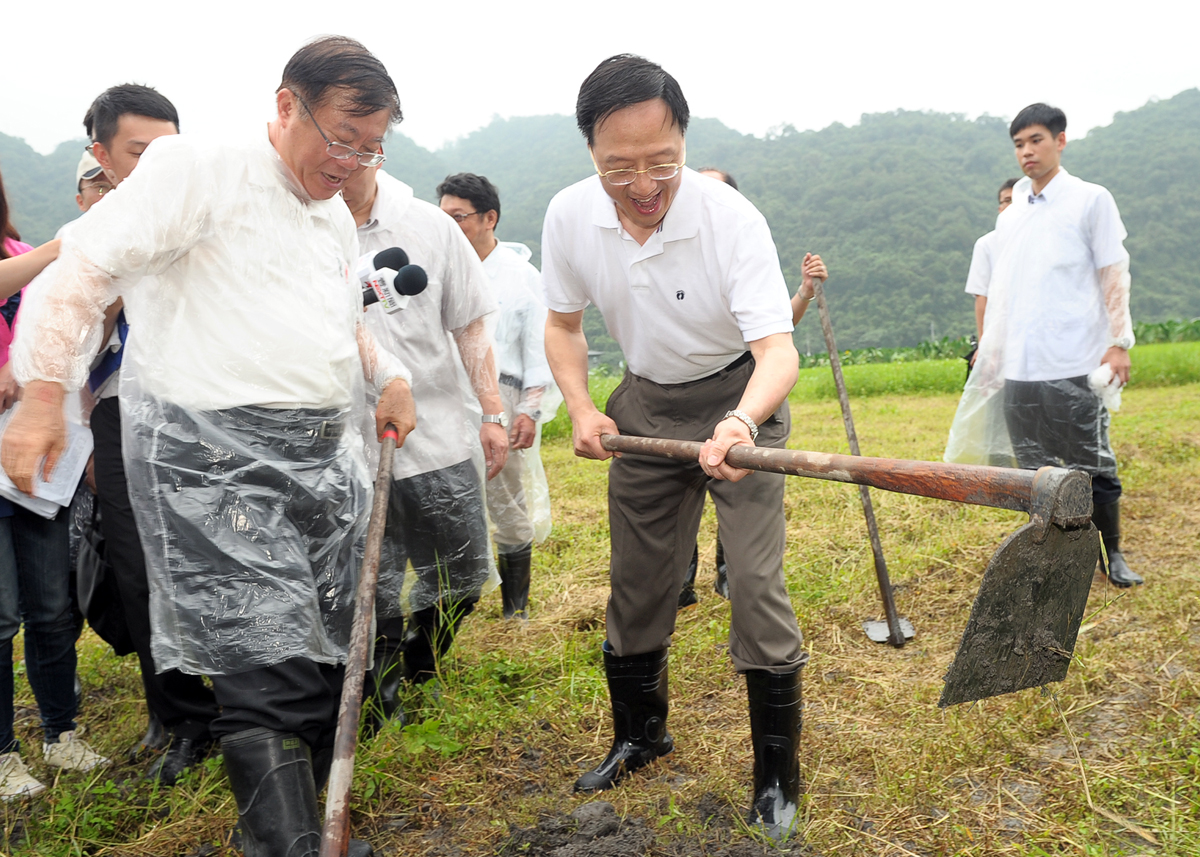 座談會後江院長在農委會主委陳保基、行政院副秘書長蕭家淇及發言人孫立群等人的陪同下前往農地,親自下田整地撿石、採收以自然農法培育出的作物,體會躬耕艱辛,同享農民收穫喜悅。