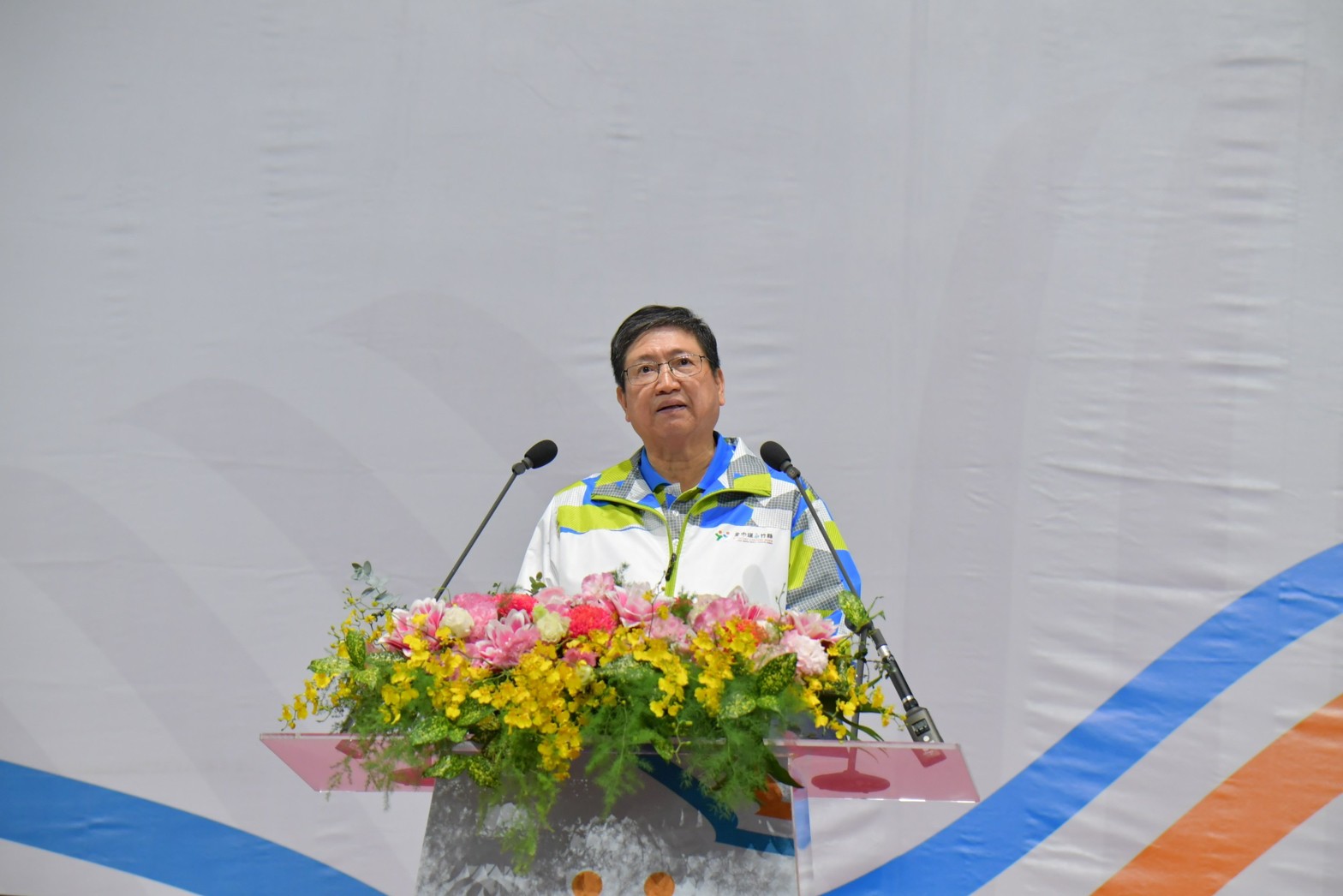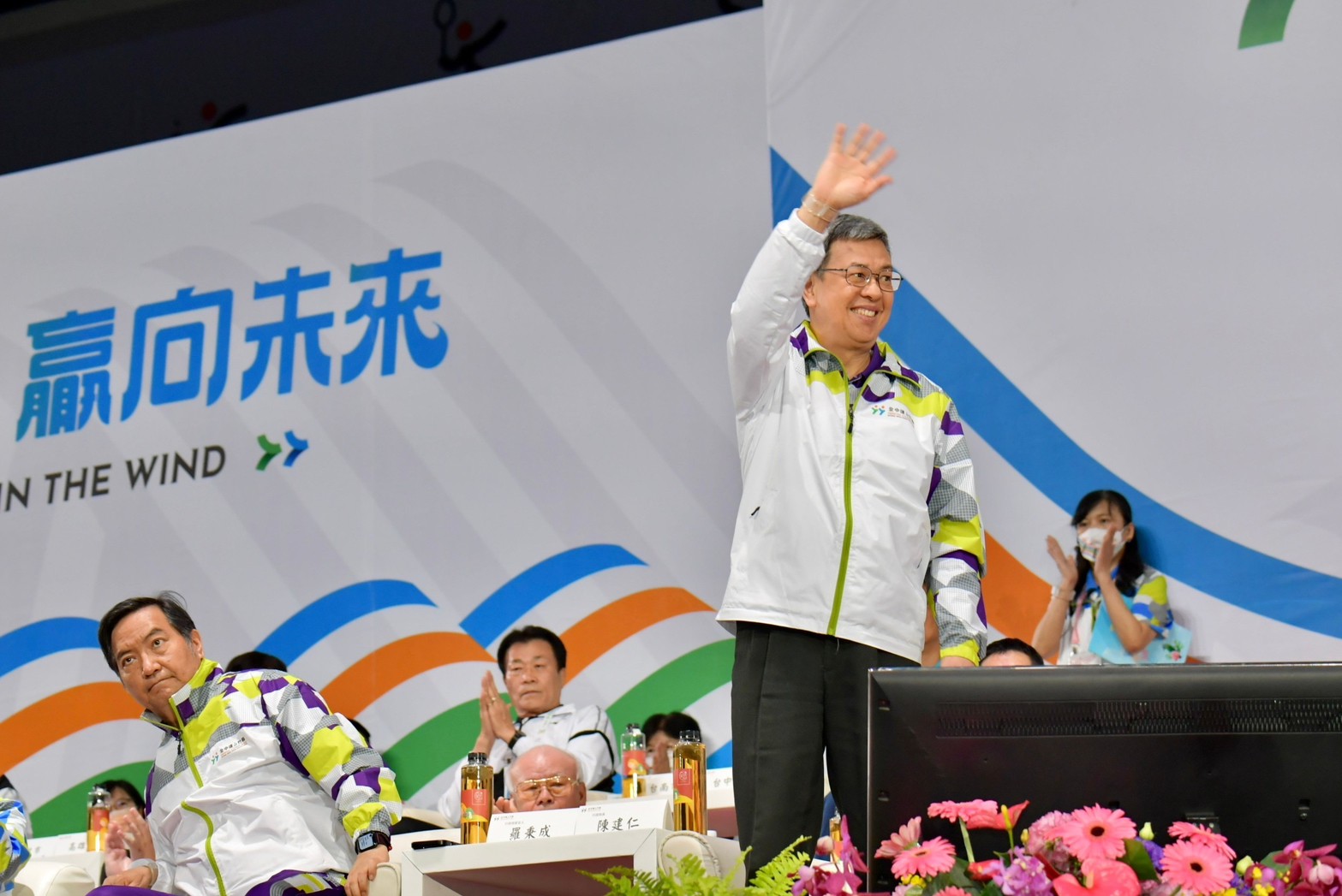 陳院長指出,欣逢112年全中運在新竹縣舉辦,首先熱烈歡迎來自全國近1萬6千名體育精英齊聚一堂,共同參與這場運動盛會,並感謝擔任此次全中運執行委員會主任委員的新竹縣楊文科縣長,以及其所領導的團隊,讓本屆賽事能夠順利舉行;同時他也感謝教育部潘文忠部長與體育署鄭世忠署長帶領教育部團隊,共同推動全中運賽事。